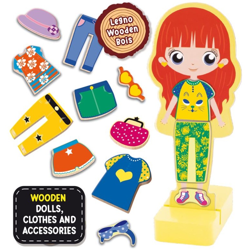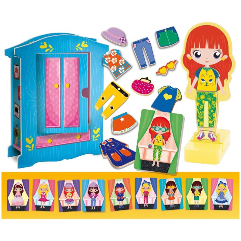 Ova igra je posebno dizajnirana za djevojčice starije od 4 godine. Drvena lutka sa stalkom omogućuje djeci da je postavljaju i mijenjaju odjeću prema vlastitim željama i maštarijama. S 26 magnetskih haljina i 10 kartica, svaki outfit će biti jedinstven i poseban.