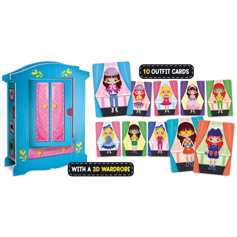 Paket sadrži 3D ormar koji se sastavlja, 26 magnetskih haljina, drvenu lutku sa stalkom, 10 kartica s odjećom, bodovne kartice sa žetonima i upute. Sve to omogućuje djeci da razviju svoju kreativnost, motoričke vještine i maštovitost.