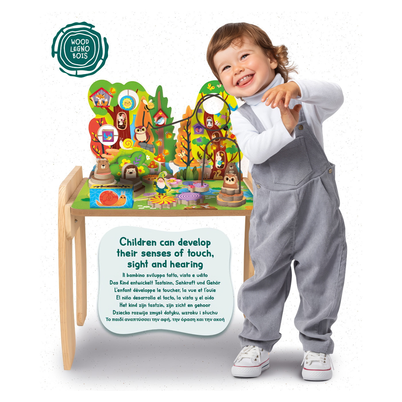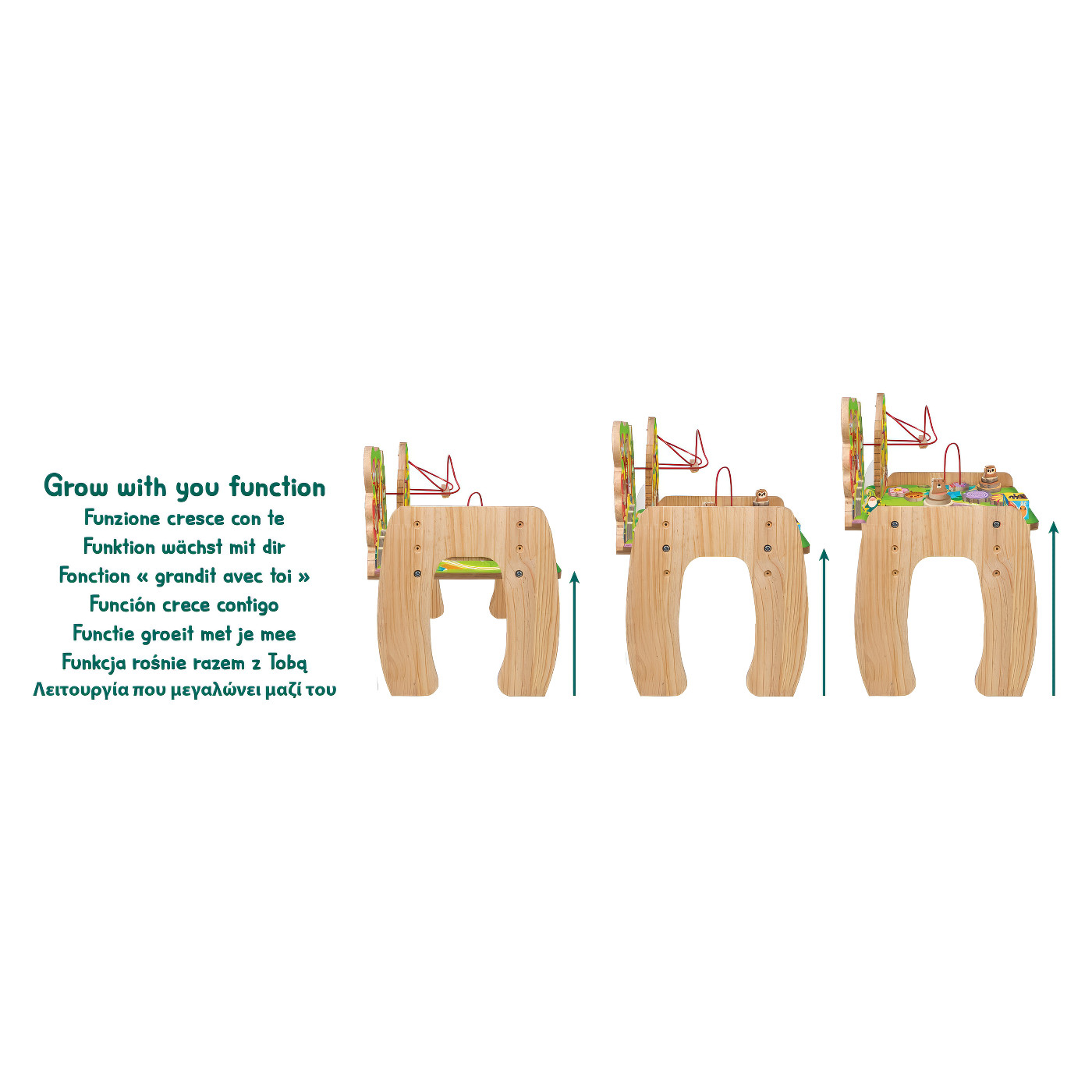 Jednostavno podešavanje visine omogućuje da stol raste zajedno s vašim mališanom, prateći njegov razvoj i potrebe. Raznolike aktivnosti – od slagalica i labirinta do zupčanika i rotirajućih oblika – pažljivo su osmišljene kako bi svakodnevna igra postala prilika za učenje i otkrivanje novih vještina. Dizajniran je za radoznale ruke i živahnu maštu, pretvarajući svaku sobu u malu oazu kreativnosti.