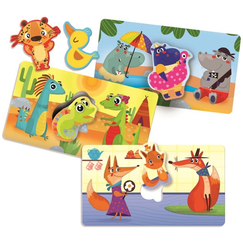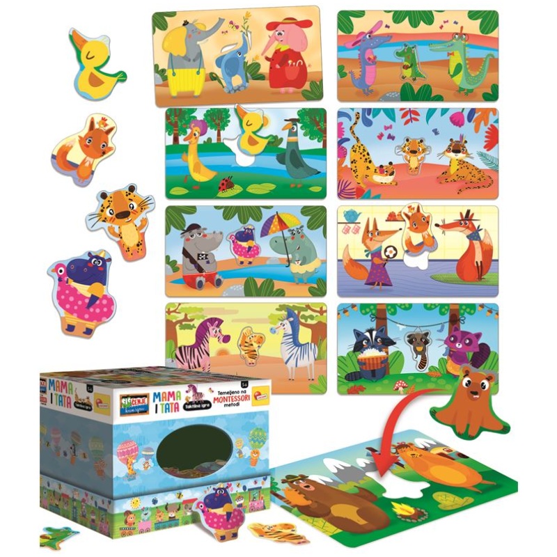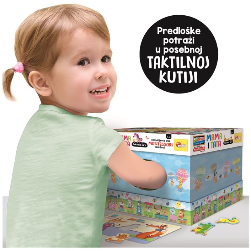 Taktilna igra Mama i Tata sastoji se od stavljanja životinja u Montessori kutiju. Mladunci su skriveni od pogleda pa dijete, stavljajući ruku u otvor, dodirom traži životinje. Cilj je popuniti mape stavljanjem svakog mladunca na odgovarajuće mjesto. Ova igra je u skladu s Montessori metodom jer potiče vježbanje taktilnog pamćenja, a prema riječima pedagoginje, rukovanje materijalima je konkretno iskustvo i ključno je za dijete kako bi moglo graditi svoju inteligenciju.