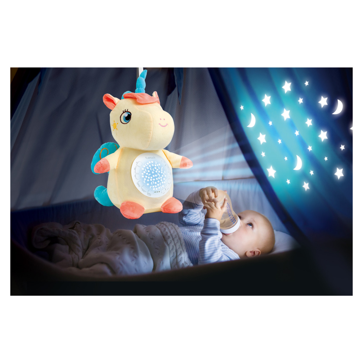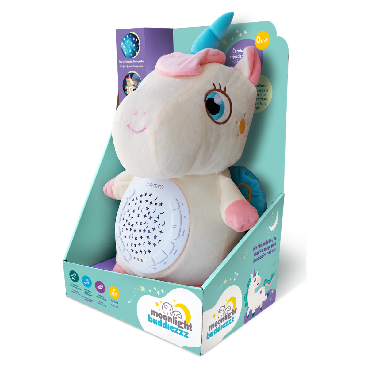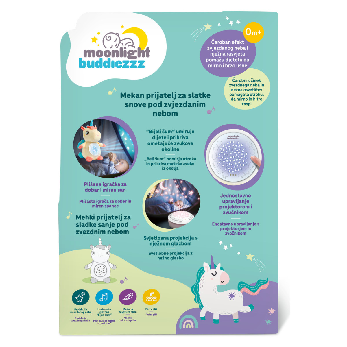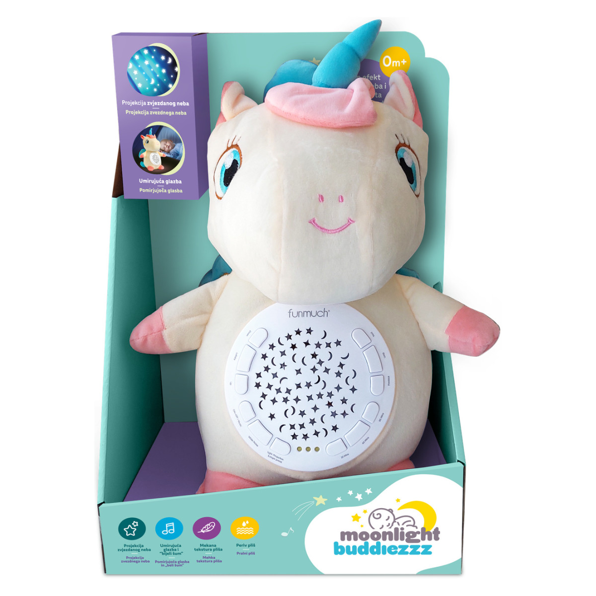 Plišana igračka ZZZ Moonlight Buddiezzz jednorog spaja mekog plišanca, uspavanke, bijeli šum i projekciju zvjezdanog neba za mirnije uspavljivanje djece.