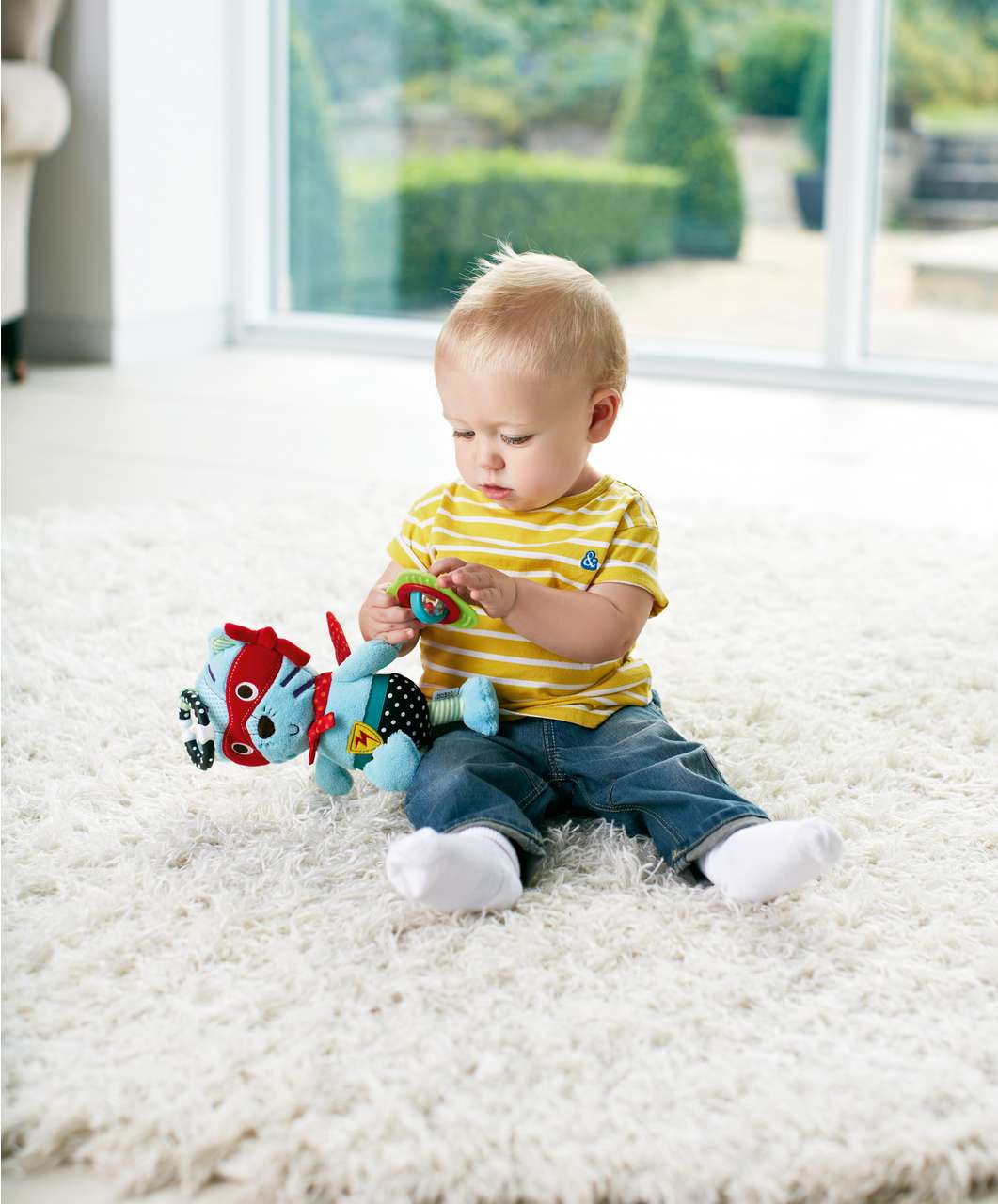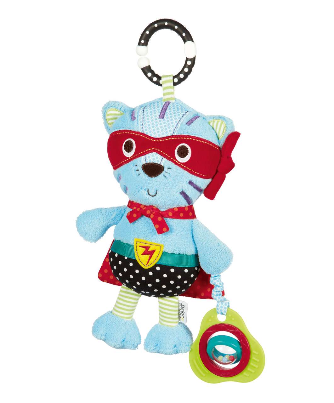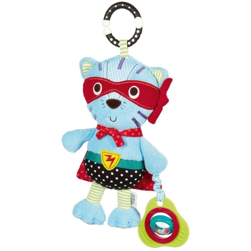Ova plišana igračka za bebe je od visokokvalitetnih netoksičnih materijala. Potiče bebinu zainteresiranost za igru i motoriku. U obliku je mačke. Na njoj se nalaze i glodalice u obliku prstena koji također omogućuje da se igračka pričvrsti za kolica ili negdje drugdje ako je potrebno kao i obliku trokuta koji u sebi sadrži rotirajuću kuglicu koja je i zvečka. Šarenih je i veselih boja. Lijep je poklon za svaku bebu.