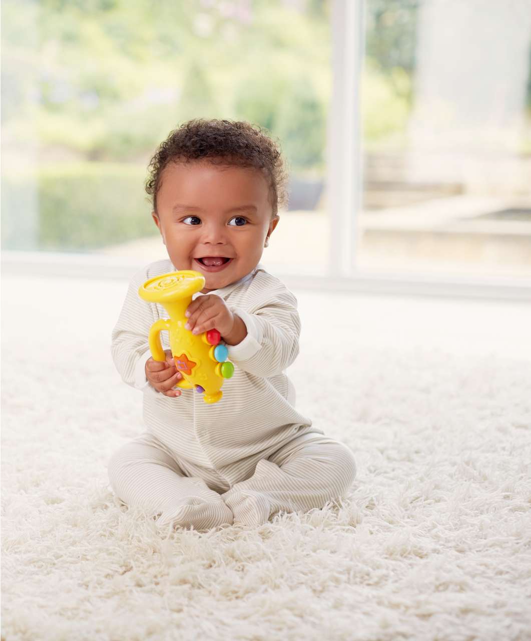 Vesela truba je idealna igračka za bebe. Svojim jednostavnim dizajnom, veselim bojama i mnoštvom zvukova i bljeskanja svjetla zaokupira bebinu maštu. Na sebi ima tipke i ručku prikladne za bebine male ručice. Igračka je prikladna za bebe od 3+ mjeseci. Potrebne 2xAA baterije (nisu uključene). Dimenzije: 15×10 cm.