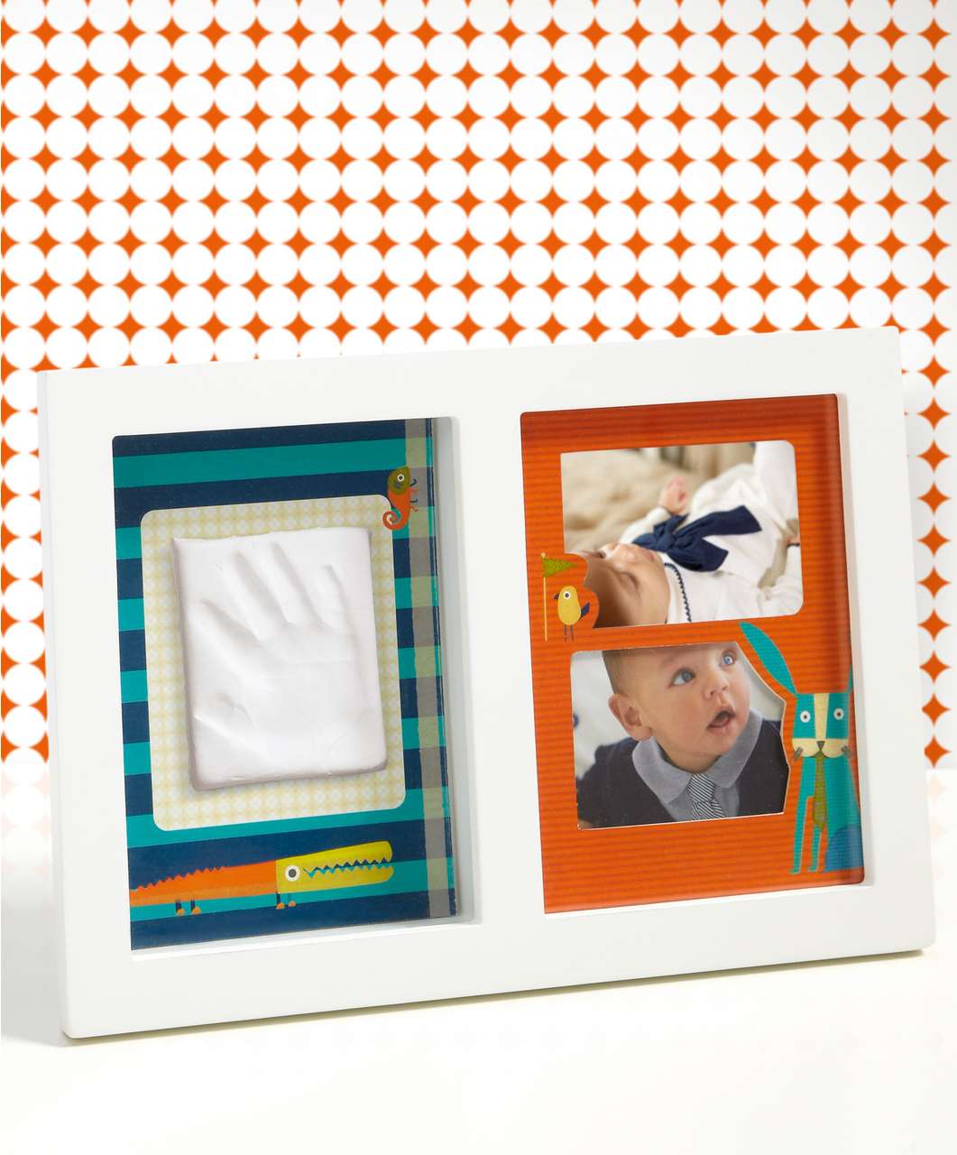 Očuvajte i pokažite one posebne trenutke iz života Vaše bebe. Ovaj jedinstveni okvir pruža Vam mogućnost umetanja dvije male fotografije te mjesto za utisnuće otiska ručice ili stopala Vaše bebe.