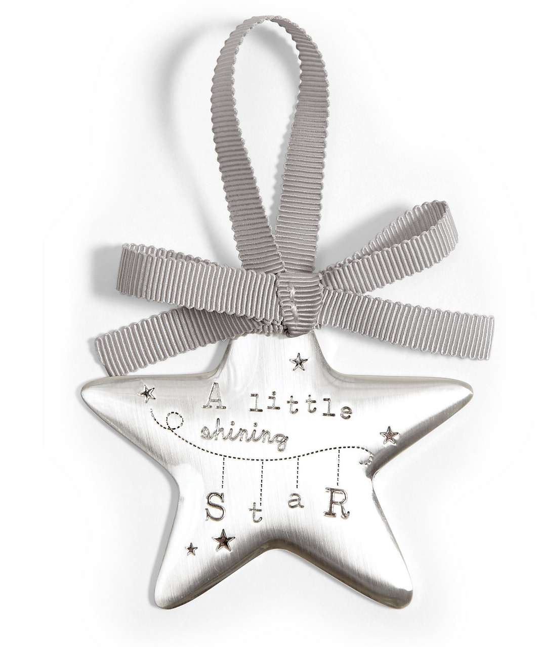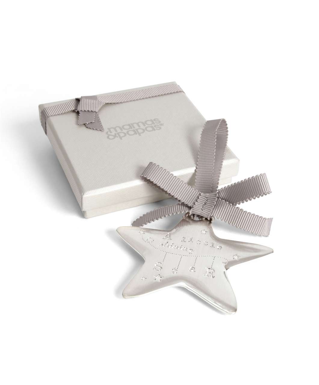 Posrebrena zvjezda dolazi u obliku privjeska okačena na vrpcu. Na njoj se nalaze urezane riječi: ‘A little shining star’ (mala zvijezda koja sja). Na poleđini se može ugravirati ime bebe. Dimenzije: 8×7 cm. Dolazi upakirana u tkanu vrećicu i ukrasnu kutiju. Prikladan je i lijep poklon za svako novorođenče.