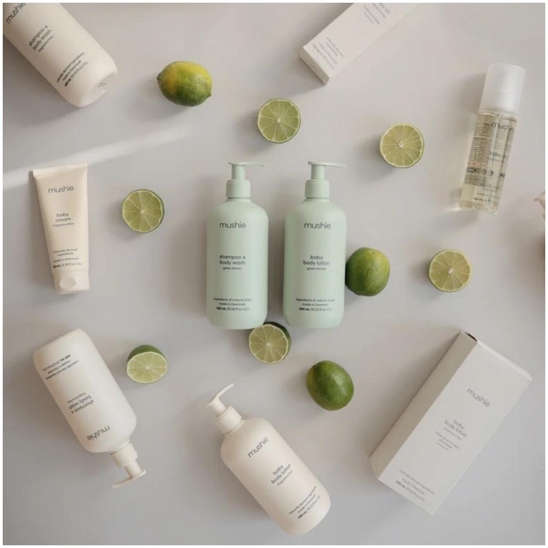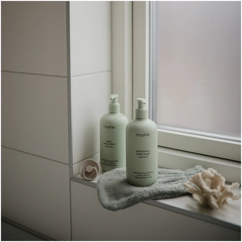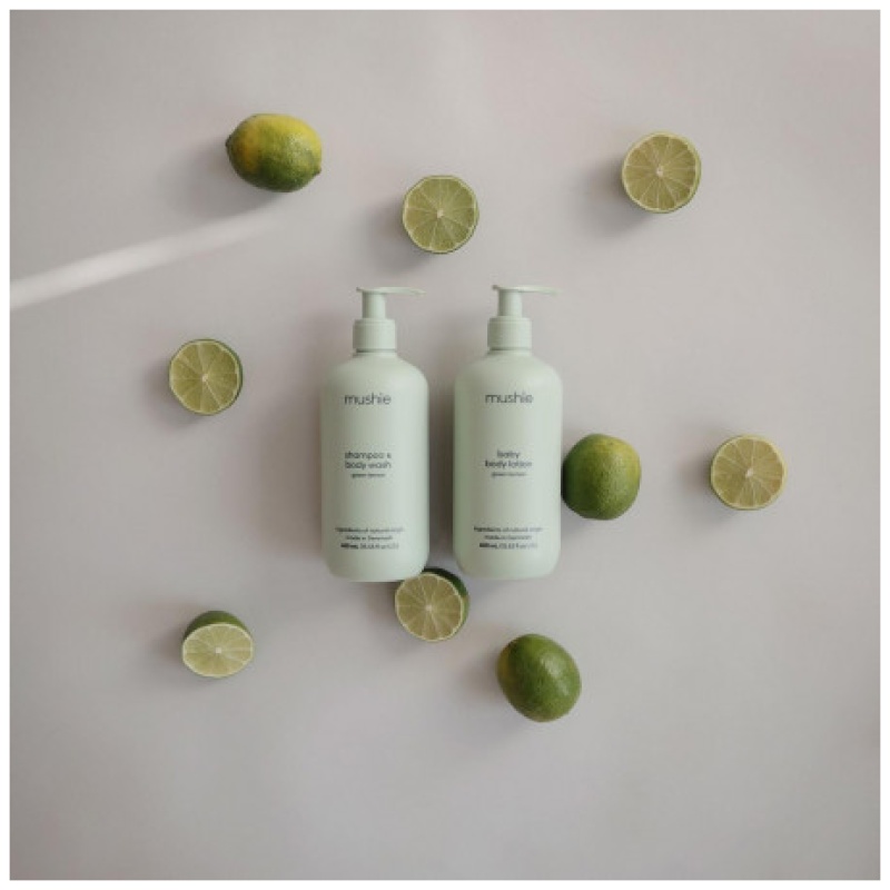 Mushie šampon i gel za tuširanje s nježnim mirisom limete je jedinstveno razvijen proizvod za njegu osjetljive kože i vlasišta beba i djece. Nježna formula sprječava dehidraciju, omekšava i vlaži. Dodajte malu količinu gela u vodu za kupanje ili kosi i temeljito isperite vodom. Zbog svog prirodnog sustava proizvod je pogodan za svakodnevnu upotrebu od rođenja nadalje, 100% je veganski te s certifikatom protiv alergija. Dio sastojaka dolazi iz organske proizvodnje pa proizvod posjeduje Ecocert Greenlife certifikat prema COSMOS standardu.