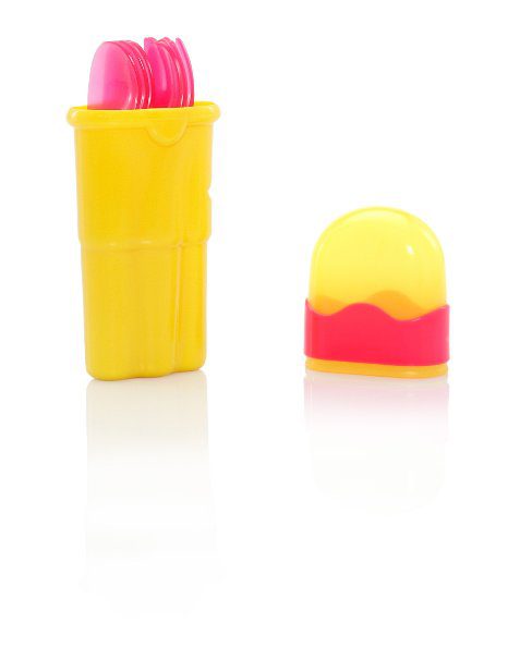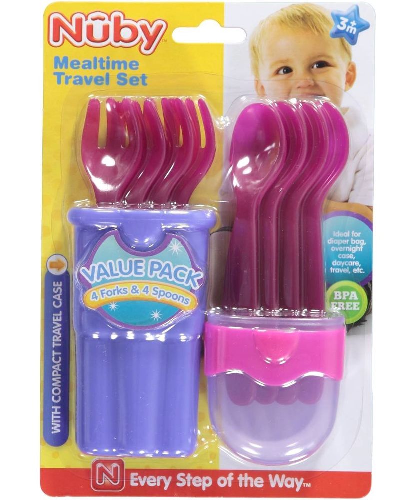 Praktični set pribora za jelo od proizvođača Nuby. Set je namjenjen za putovanja. U setu dolaze posuda za čuvanje pribora, 4 žlice i 4 vilice. Napravljeno je od kvalitetne plastike. Namjenjeno za bebe od 3 mjeseca.