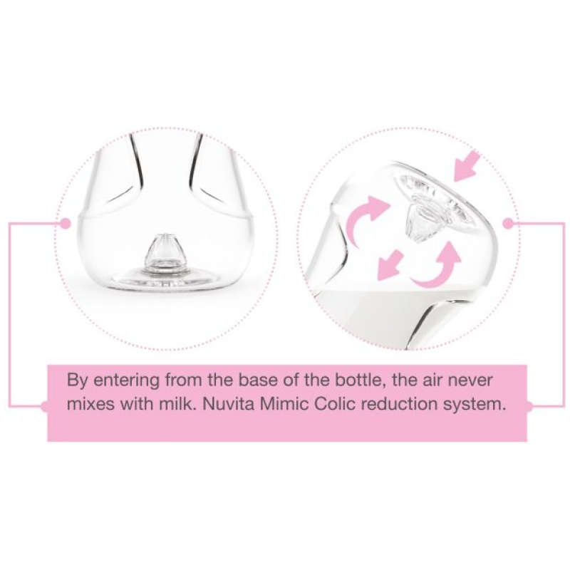 -Ulazeći s osnove boce, zrak se nikada ne miješa s mlijekom. Nuvita Mimic Colic sustav redukcije.