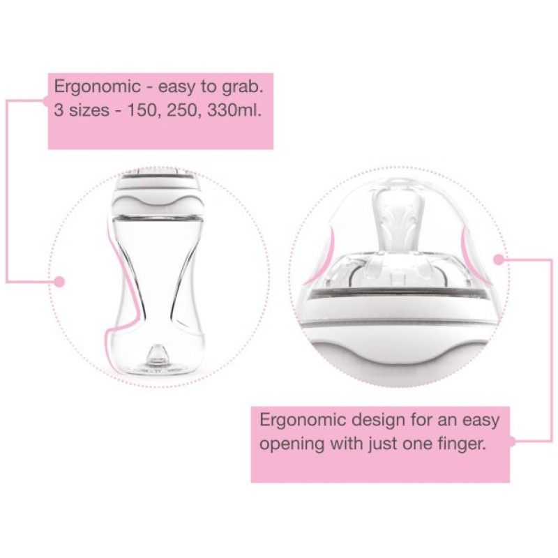 -Beba se može hraniti bez gutanja zraka koja imitira majčinu dojku u smislu svog oblika, elastičnosti, pokreta i fizičkog osjećaja.