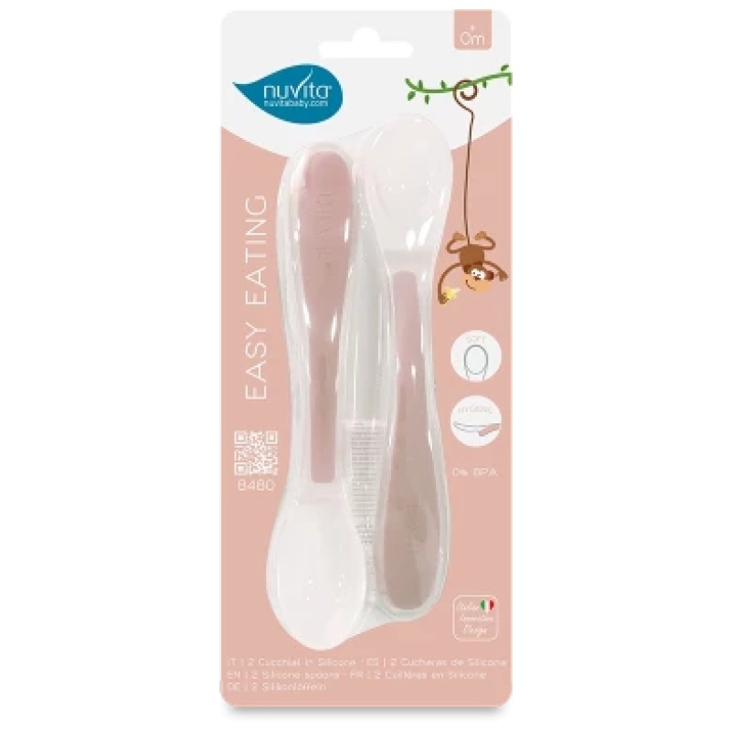 Nuvitin Easy Eating set od 2 silikonske žlice idealan je za poticanje tvog djeteta da samo jede. Silikonski dio je nježan prema desnima i prvom zubima, a stražnji dio ima posebnu higijensku podršku koja je dizajnirana da ne dodiruje površinu stola kad se postavi.