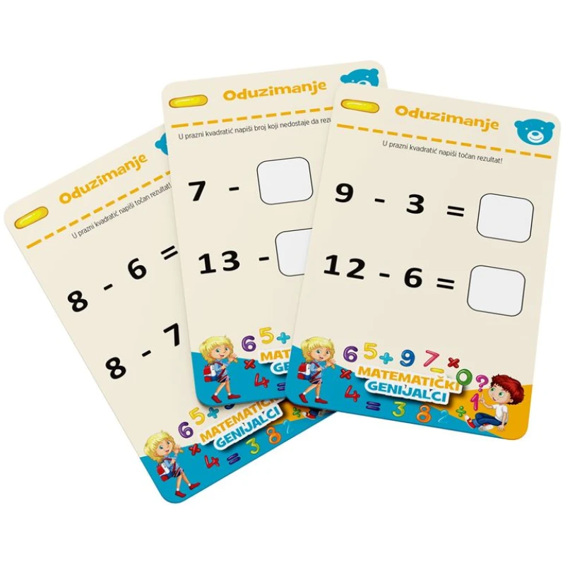 Edukativne Karte Piši Briši+Marker: Oduzimanje nisu samo obične kartice, već alat koji će vašem djetetu pomoći razviti svoje matematičke vještine na zabavan, interaktivan i praktičan način. Ne čekajte, pridružite se našem brojnom krugu zadovoljnih roditelja i pružite svom djetetu prednost u matematici već danas!