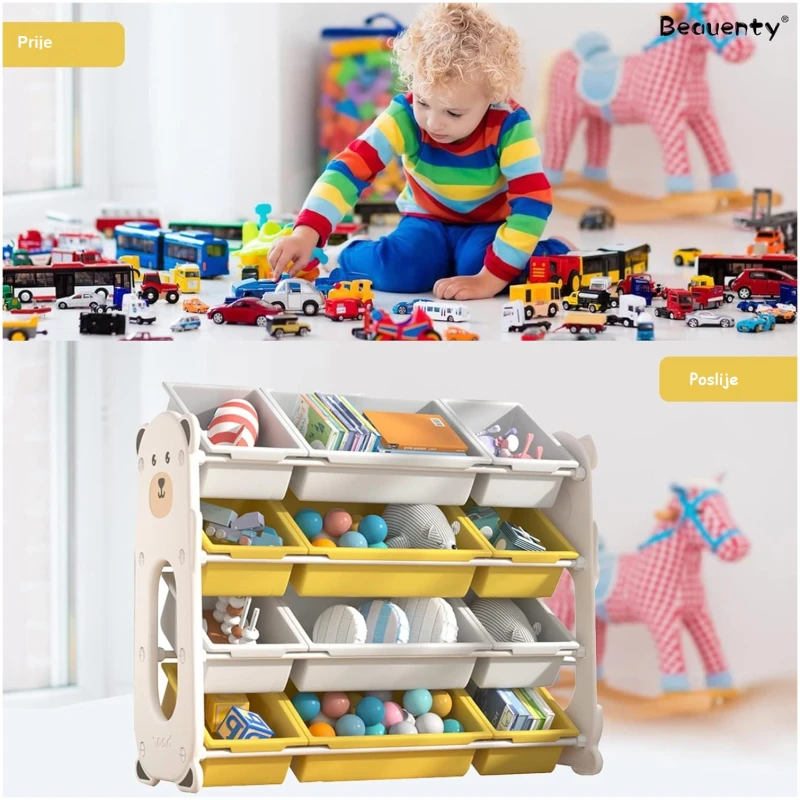 Stalak za pohranjivanje u 4 sloja ima ogroman prostor za pohranjivanje svih vrsta igračaka, bilo da se radi o lutkama, kockama, knjigama, loptama ili plišanim igračkama, što čini dječji prostor za igru čišćim i organiziranim.