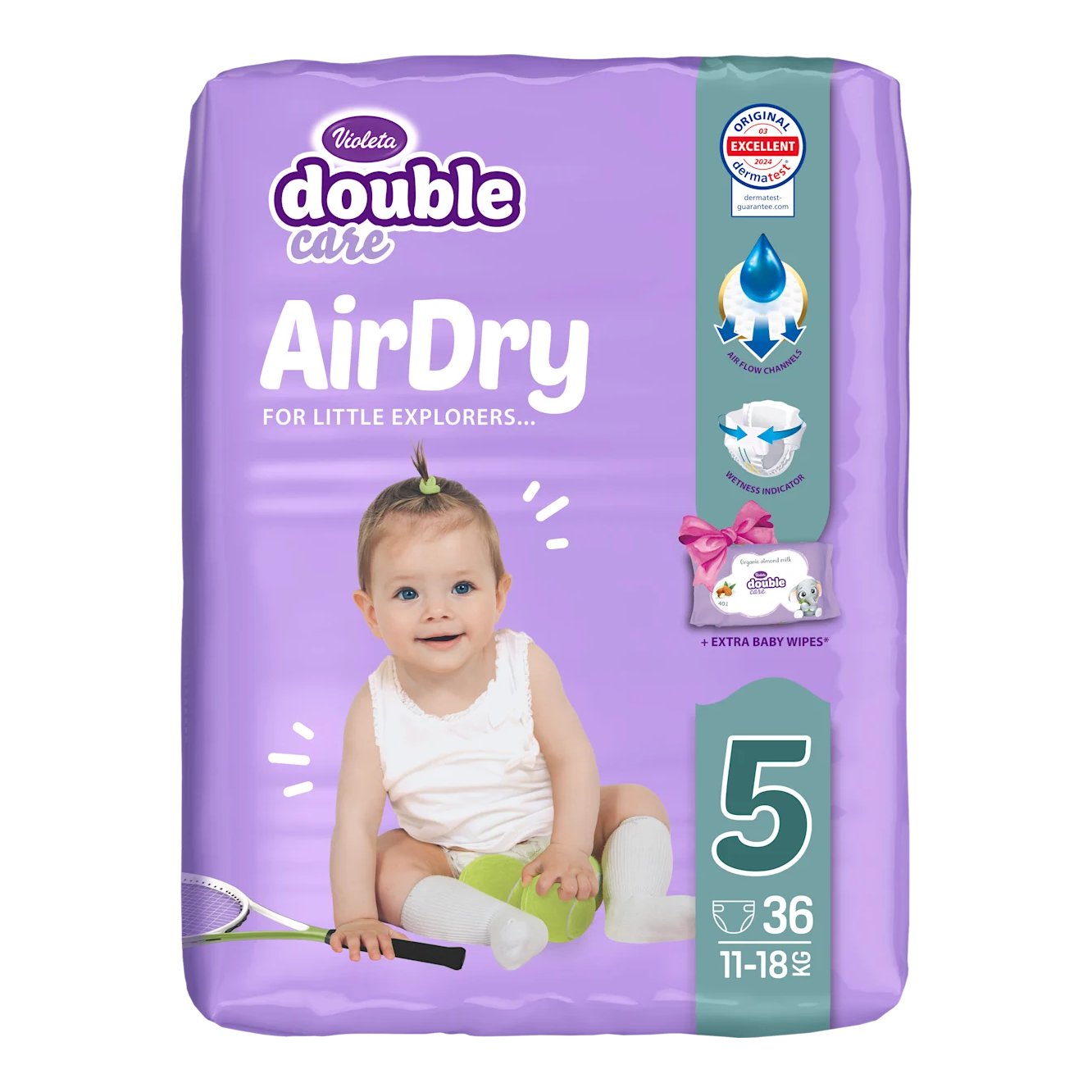 Purple pack of Violeta Double Care AirDry baby diapers, size 5 (11–18 kg), 36 diapers, lavender background with a smiling baby image.