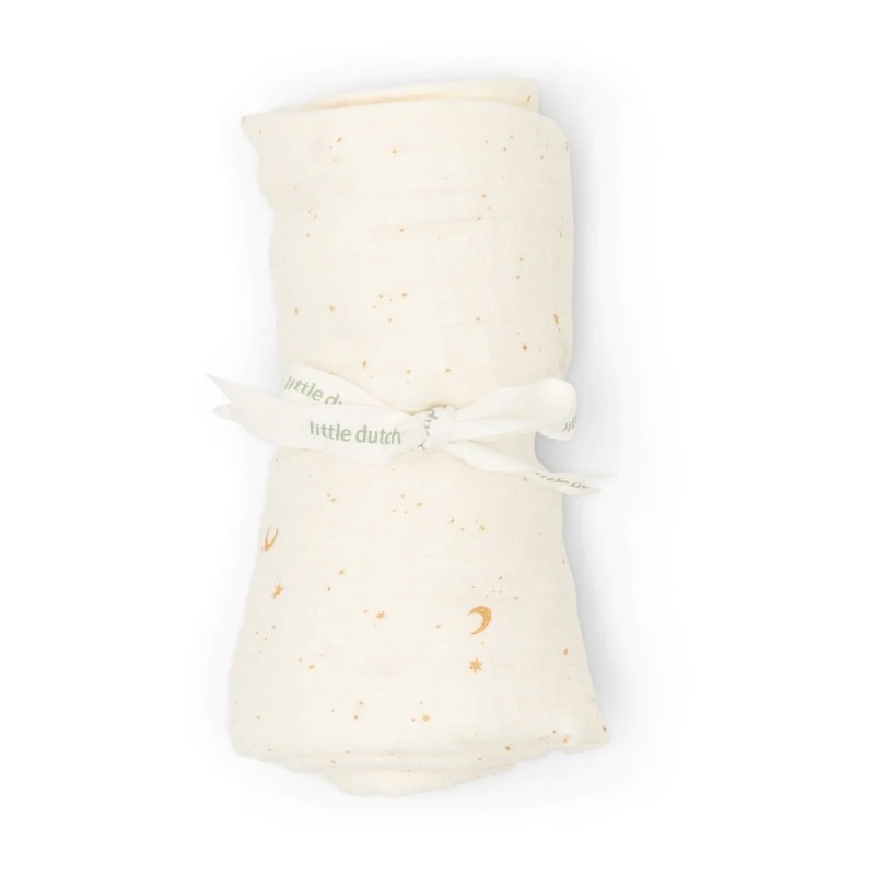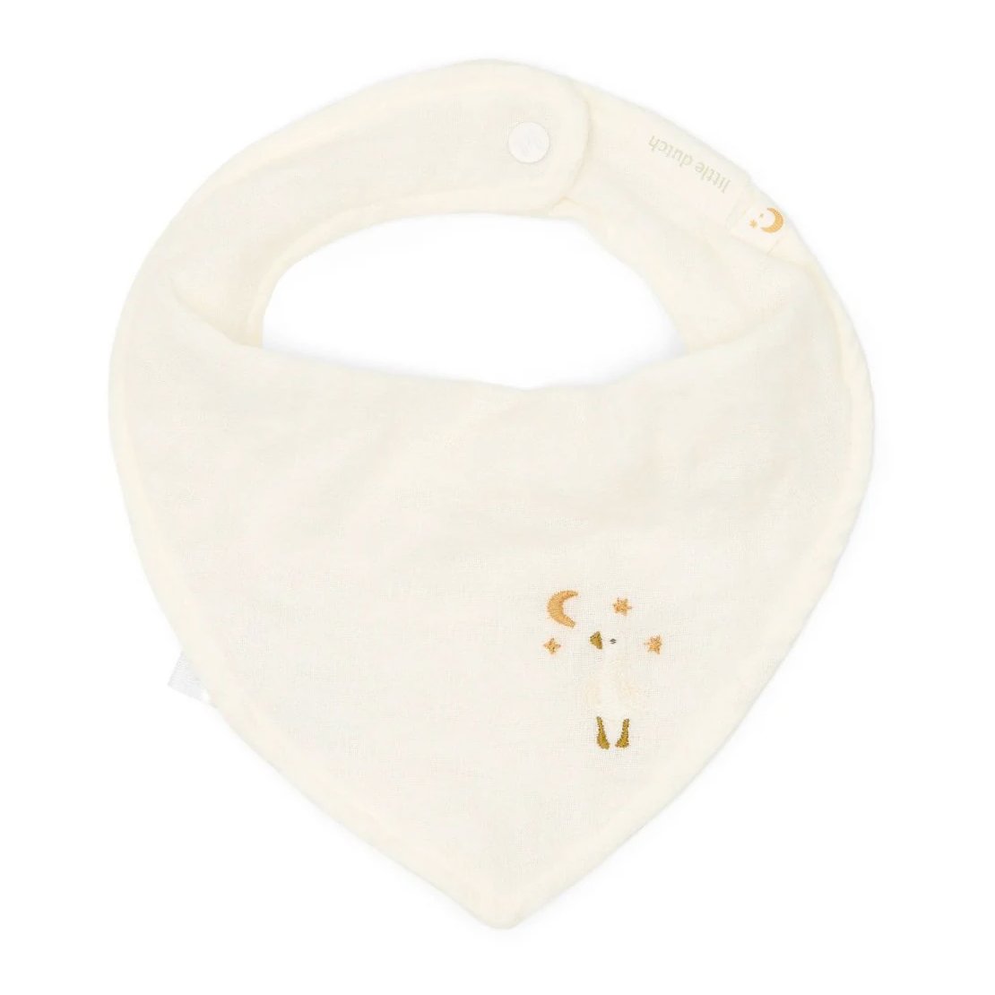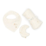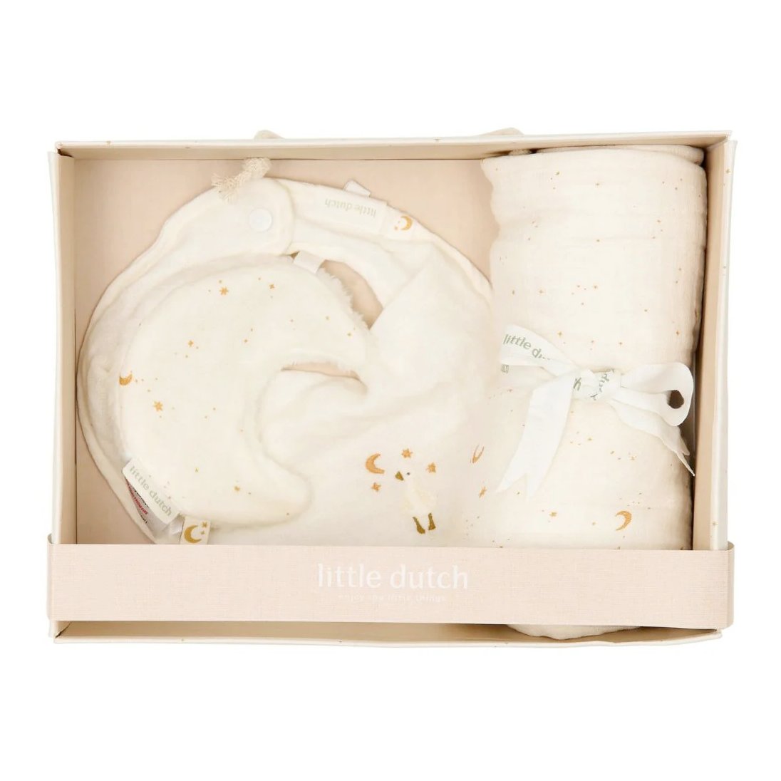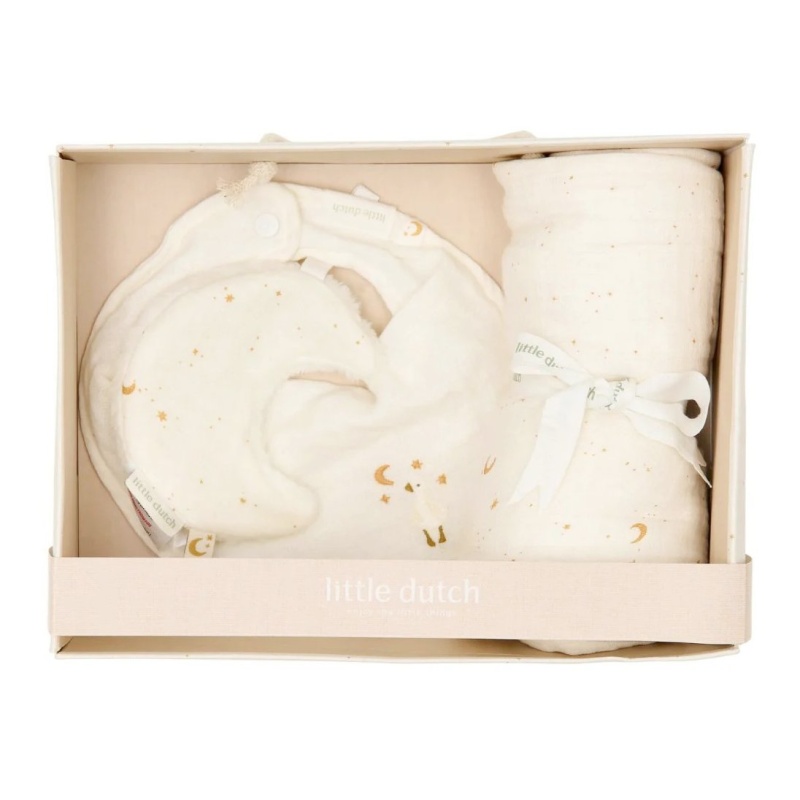Little Dutch poklon set Moon & Stars. Ovaj luksuzni set pruža ne samo praktičnost, već i nježnost potrebnu za vašu bebu. Sadrži tri neophodna proizvoda: muslinsku krpicu, tješilicu i bandanu, sve izrađene od 100% organskog pamuka. Njihova predivna Moon & Stars print i smirujuća Soft White boja s nježnim vezom će unijeti toplinu u svakodnevne trenutke njege i igre.