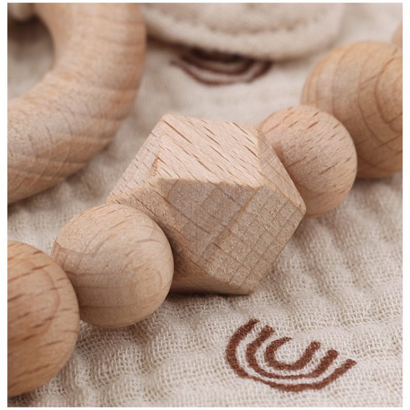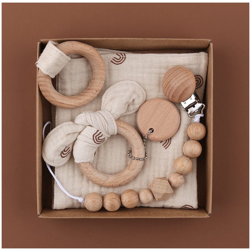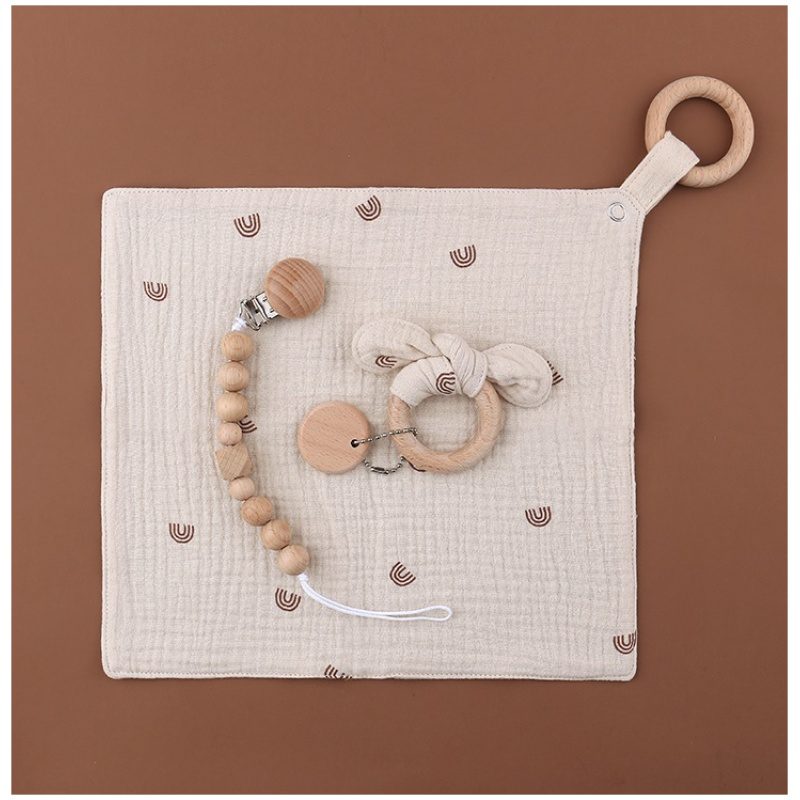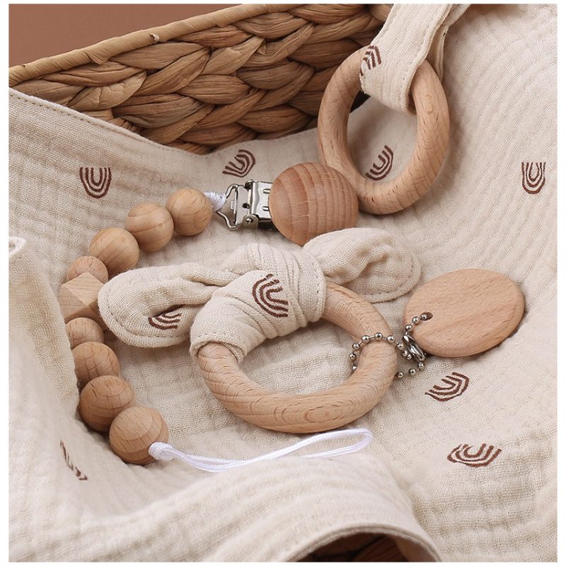 JEDINSTVEN POKLON ZA BEBE: promišljen dar za novorođenče, uključuje 1 mekanu muslin krpu za bebe s drvenim prstenom, 1 drvenu muslin zvečku i 1 drveni lanac za dudu.