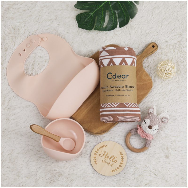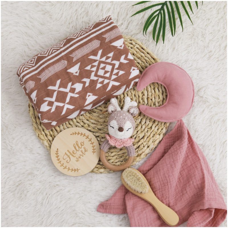 JEDINSTVEN POKLON ZA BEBE: promišljen dar za novorođenče, uključuje 1 mekani muslin prekrivač za bebe, 1 drvenu ploču , 1 heklanu zvečku , 1 drveni češalj, 1 slikonski siperak, 1 silikonsku zdjelu, 1 silikonsko drvenu žlicu za bebe