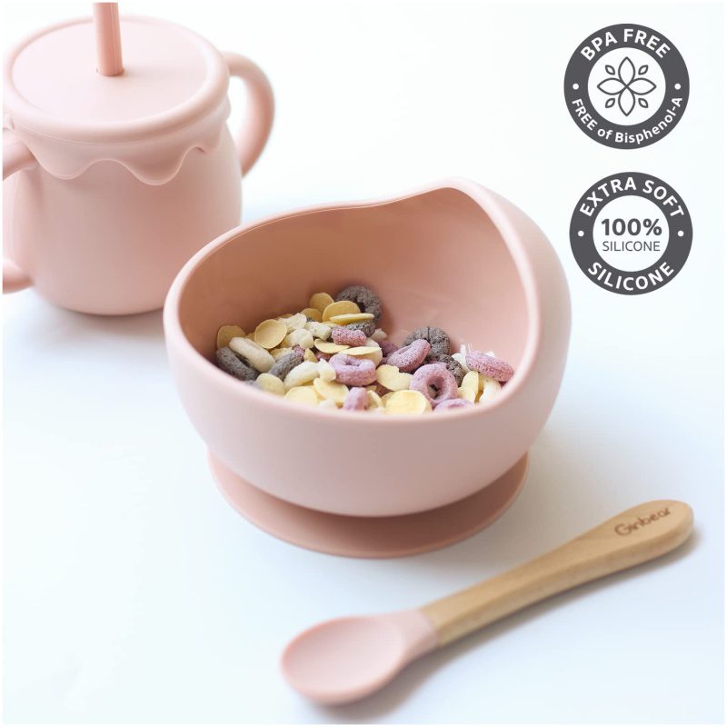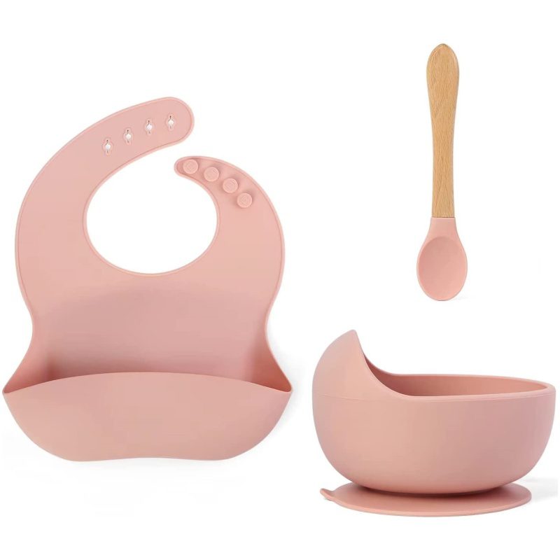 SILIKONSKI SET ZA HRANJENJE je izrađen od silikona za hranu koji je bez BPA, PVC, FTALATA, KADMIJA I OLOVA. Testirao ga je CPSC laboratorij. Set se sastoji od zdjele s vakumskim dnom, silikonske žlice s drvenom ručkom i silikonskog siperka.