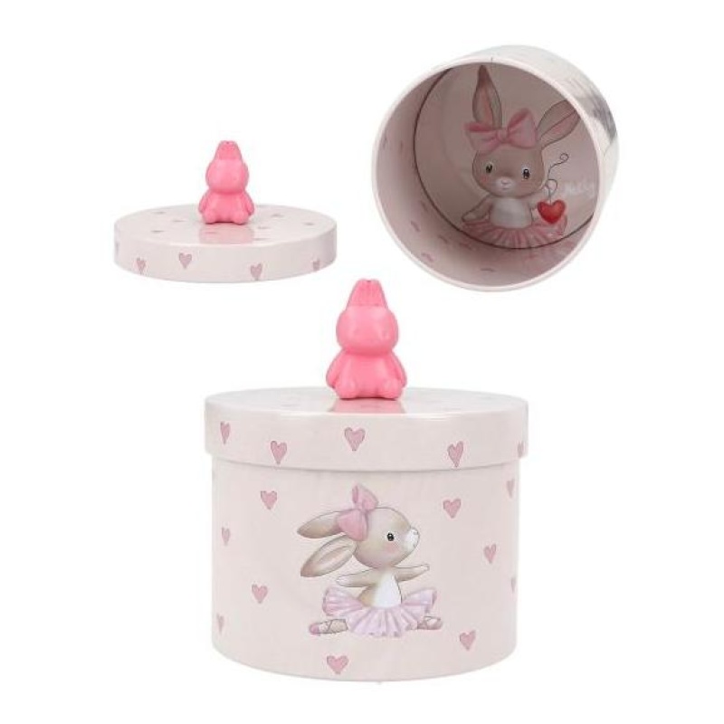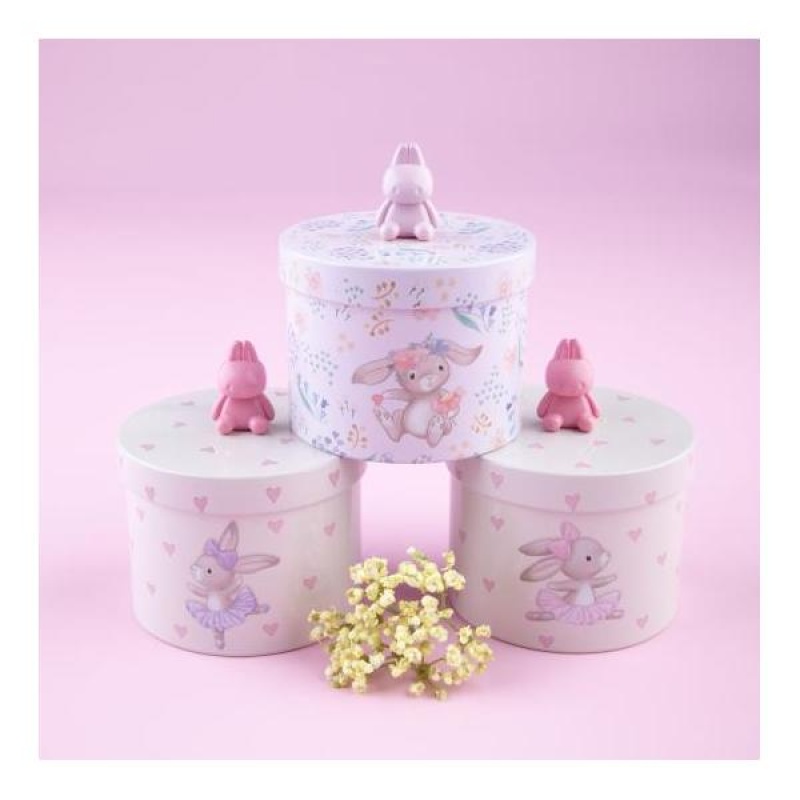 Dostupna u ružičastoj i ljubičastoj verziji, svaka kutijica nosi preslatke ilustracije baletnih zečića, srca i cvjetića koji cvjetaju kao tvoje razigrane maštarije. Svaki detalj slavi nježnost djetinjstva i radost čuvanja malih blaga. Poklopac dolazi s posebnom ručkom u obliku zečića – ne samo slatkom, već i praktičnom jer ti omogućuje lako otvaranje i zatvaranje. Bez poteškoća, bez pomoći.