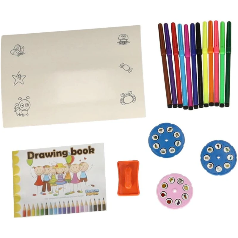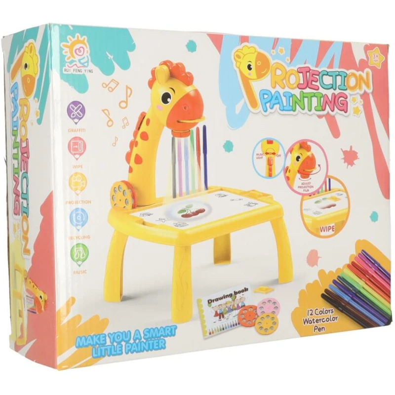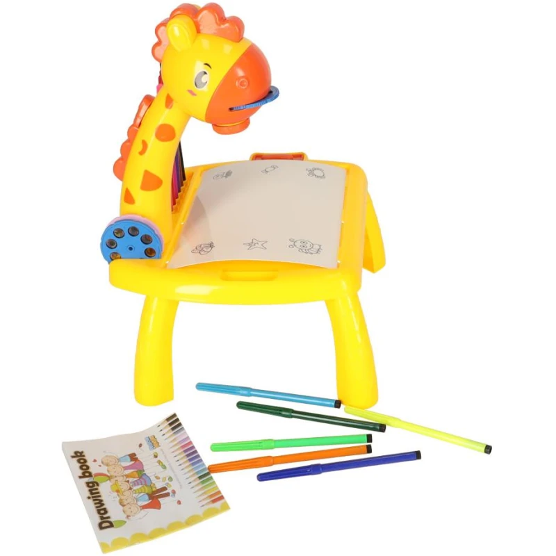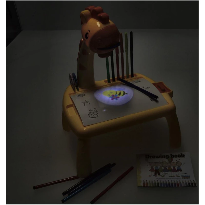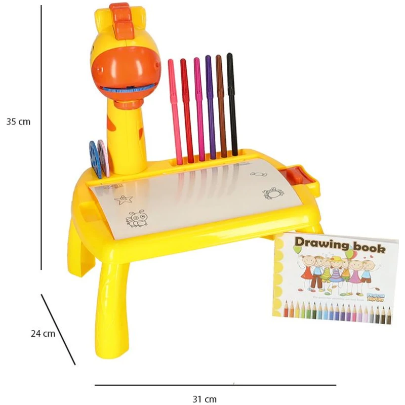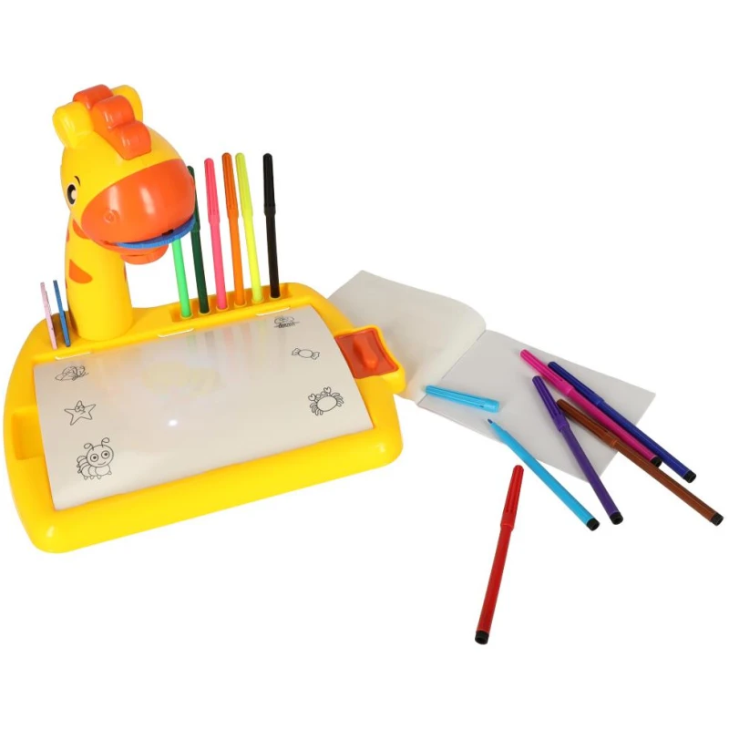 Sa svojim veselim i upečatljivim žutim dizajnom i oblikom žirafe, ovaj projektor će sigurno privući pažnju svakog mališana. U sklopu seta dolaze i šareni flomasteri i knjižica za crtanje, ali to nije sve. Možete crtati i na podlozi koja se jednostavno može obrisati, a za brisanje slike tu je i spužva koja je također dio seta.