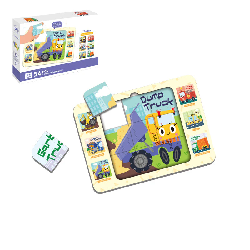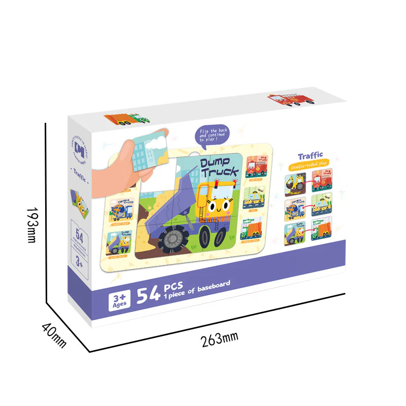 Ova jedinstvena slagalica nije obična igračka. Svaki od 54 dijela pažljivo je izrađen kako bi djeci omogućio nezaboravno iskustvo učenja kroz igru. S temom vozila i posebno osmišljenim ilustracijama kamiona kipera, vaš mališan će imati priliku naučiti više o prometu i vozilima dok razvija finu motoriku i prostornu inteligenciju. Dvostrani dizajn dodaje sloj složenosti i uzbuđenja, omogućujući djeci da istovremeno istražuju dvije teme.