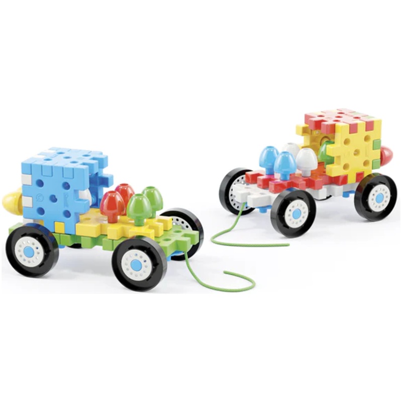 – Set sadrži sve potrebne dijelove za izgradnju jedinstvenih vučnih vozila, uključujući kliješta, žice, kotače i šarene pločice.