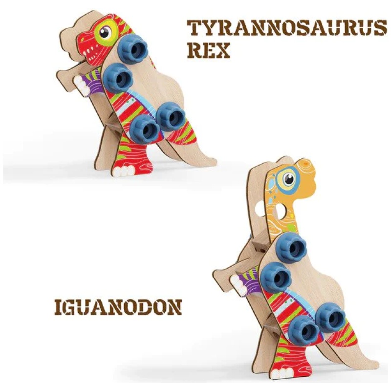 Zamisli! Kreiraj različite vrste dinosaurusa koristeći drvene oblike i bio-plastične vijke i matice. Na kraju ih ukrasi prema svojem raspoloženju. Uzbudljivost i ekološka održivost su zajamčeni. Pogodno za djecu od 3 godine.