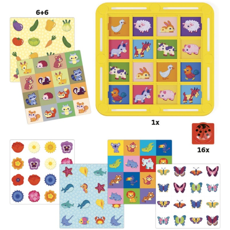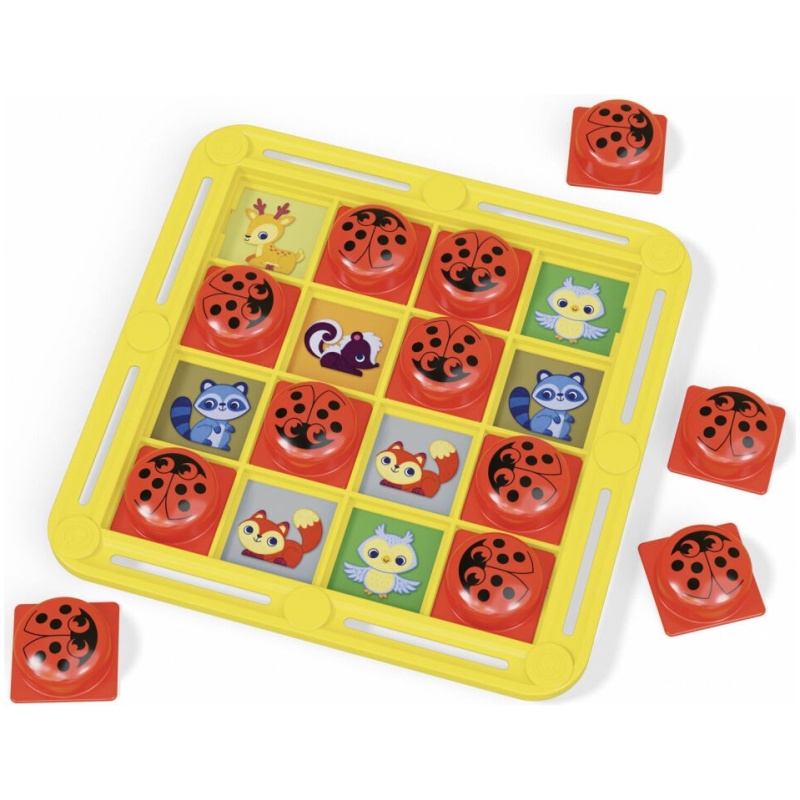 Igra sadrži 12 ilustriranih kartica i ukupno 192 originalna crteža, koji će ti pomoći da vježbaš vizualno pamćenje i koncentraciju. Simpatični kapica s bubamarama pokrivaju igraću površinu, a ti ćeš morati pronaći pravi par slika koji se krije ispod njih.