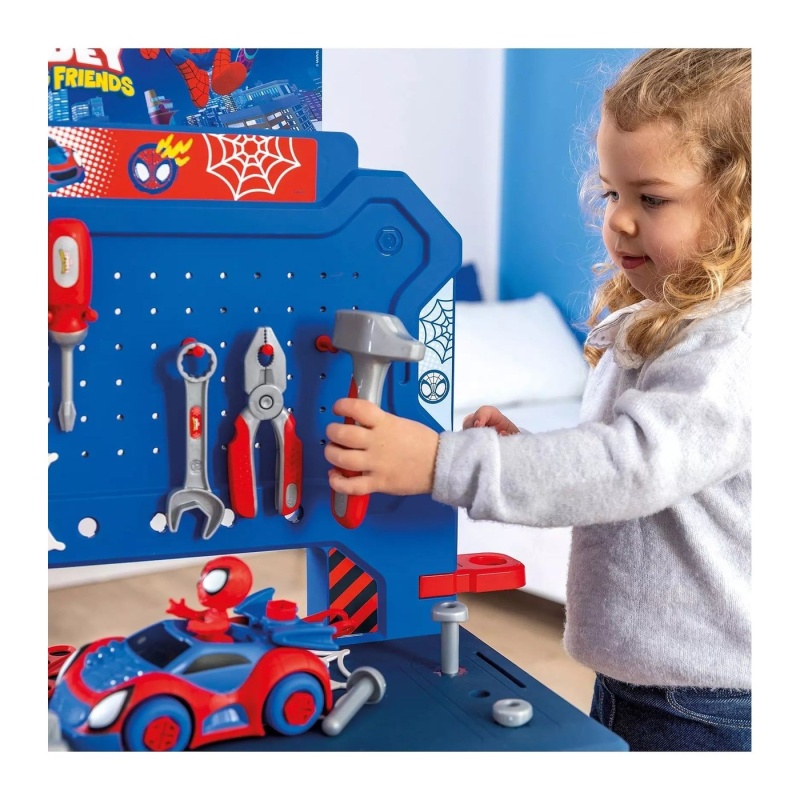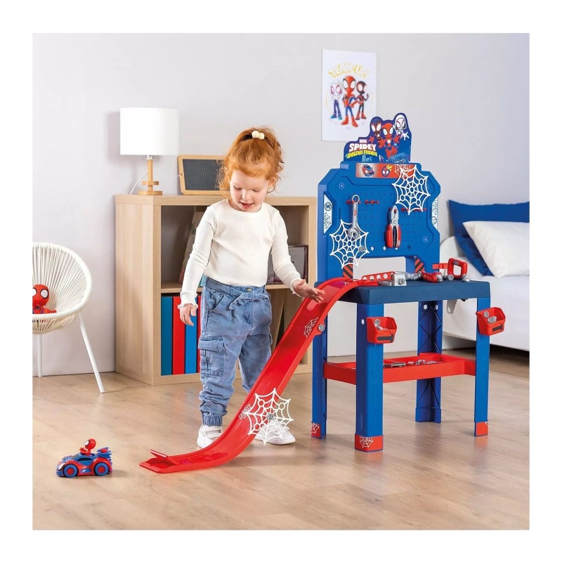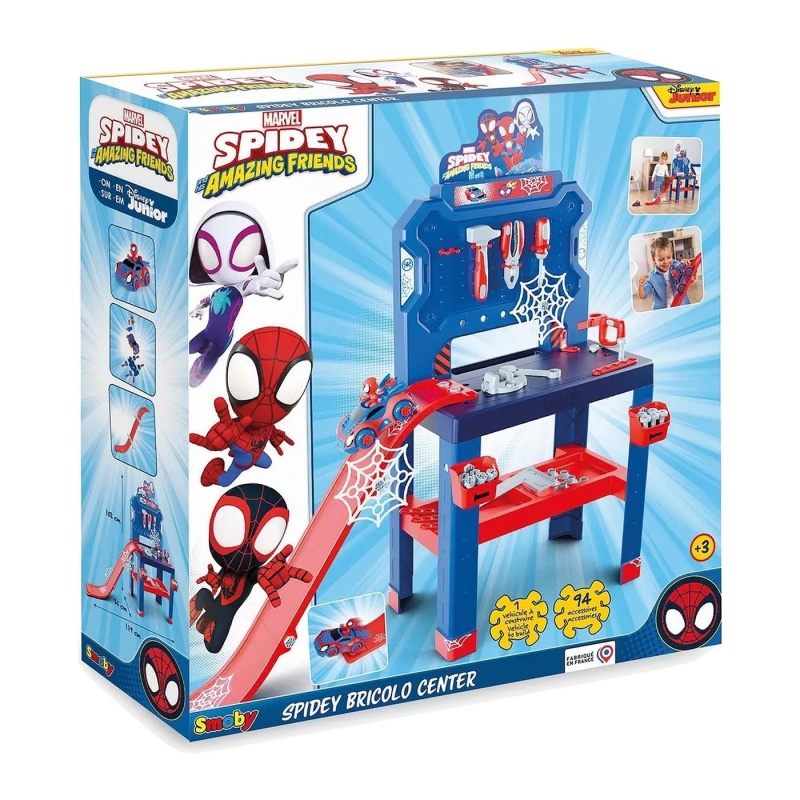 Opremljen s više od 90 izvanrednih dodataka, Smoby Spidey radni stol osmišljen je da stimulira znatiželju i potiče kreativnost. Djeca mogu izgraditi vlastitu lansirnu stazu, sastaviti Spideyjev auto i promatrati ga kako skače preko rampe! Uz to, mališani mogu uživati u raznim DIY aktivnostima koristeći alate poput pile, ključa, čekića, odvijača i još mnogo toga. Uz visinu pladnja od 53 cm, savršeno je prilagođen djeci starijoj od 3 godine.