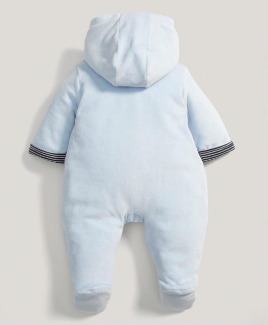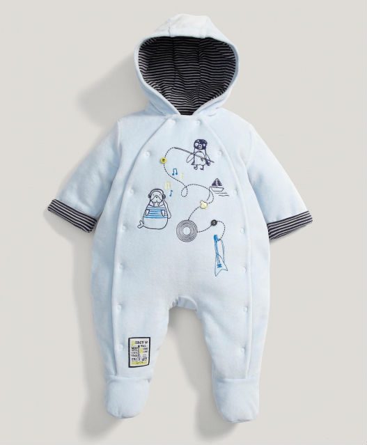 Lijepi i praktični skafander za dječake. Svijetlo plave boje, mekanih tkanina i lijepog dizajna. Potječe iz Mamas&Papas kolekcije. Jako je topal i udoban za bebu. Jednostavno se navlači. S prednje strane se nalazi dvoredno kopčanje na gumbe. Ima integriranu kapuljaču i vesele motive. Sastav: 100% pamuk, punjenje 100% poliester.