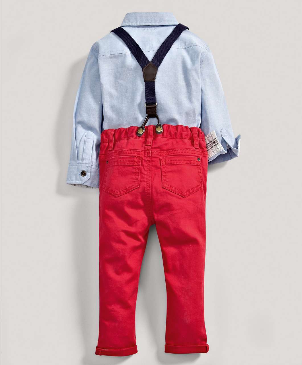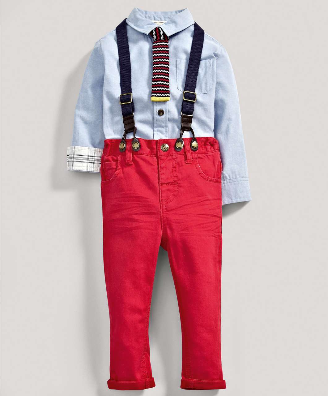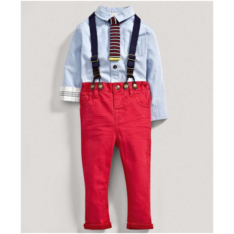 Kvalitetni komplet za dječake modernog je dizajna i lijepih boja. Dolazi u četiri dijela, traperice, košulja, kravata i tregeri. Košuljica je pamučna, plave boje te idealno pristaje uz ovu kombinaciju. Traperice su crvene boje, a uz njih dolaze tregeri koji se mogu skidati. Kravata je veselih boja i pričvršćuje se jednostavno pomoću čićka. Prikladan je i moderan poklon za svakog dječaka.