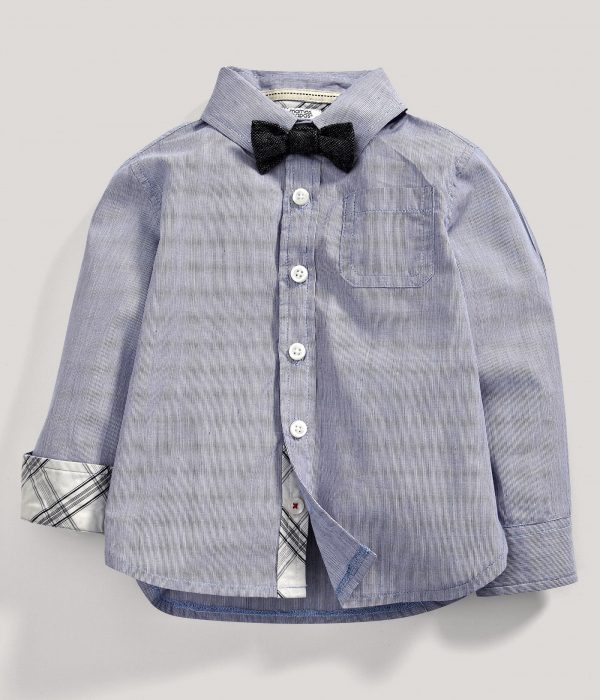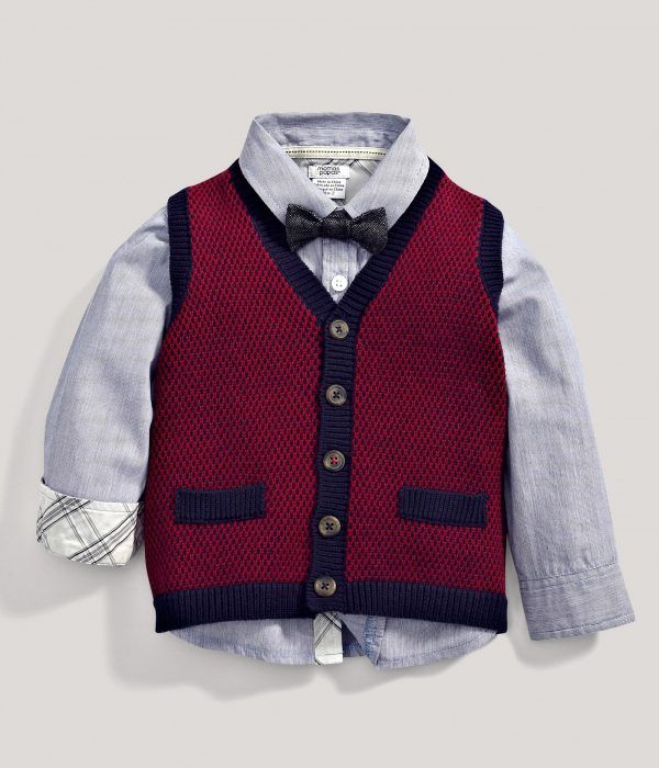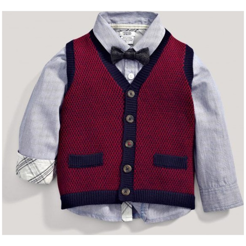 Kvalitetni komplet za dječake od proizvođača Mamas&Papas. U kompletu dolaze 3 dijela, košulja, leptir mašna i džemper-prsluk. Košulja je plave boje, dugih rukava s gumbičima s prednje strane. Leptir mašna je crne boje. Džemper-prsluk je crveno-plave boje s gumbičima s prednje strane. Komplet je izrađen od kvalitetnih udobnih materijala. Perivo u perilici na 40`. Sastav: košulja-100% pamuk, prsluk-100% pamuk, mašna-62% poliester, 17% akril, 8% viskoza, 6% pamuk, 4% najlon i 3% vuna.