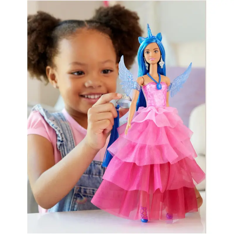 Proslavite 65. rođendan Barbike na bajkovit način uz čarobnu lutku! Ova predivna alicorna (krilati jednorog) inspirirana je njenim likom iz Barbie Dodir Magije i nosi ružičastu haljinu koja mijenja boje. Njena plava kosa ima traku s jednorogom, dok narukvice na krilima i odvojivi rep dodaju dodir fantastičnog stila. Ima srebrne naušnice, sandale s vezicama, četkicu za kosu i čarobnu alicornu za dečka! Lutka ne može stajati sama. Boje i dizajn proizvoda se mogu razlikovati.