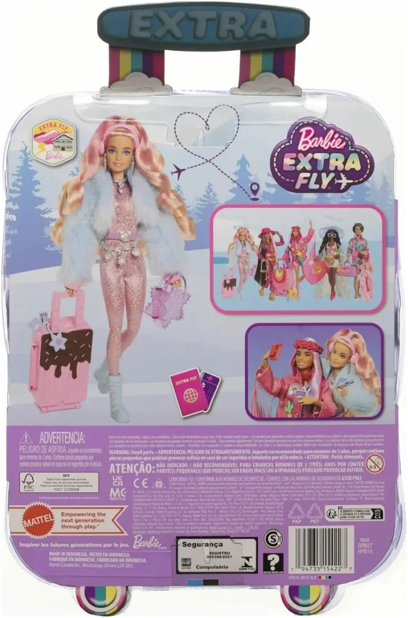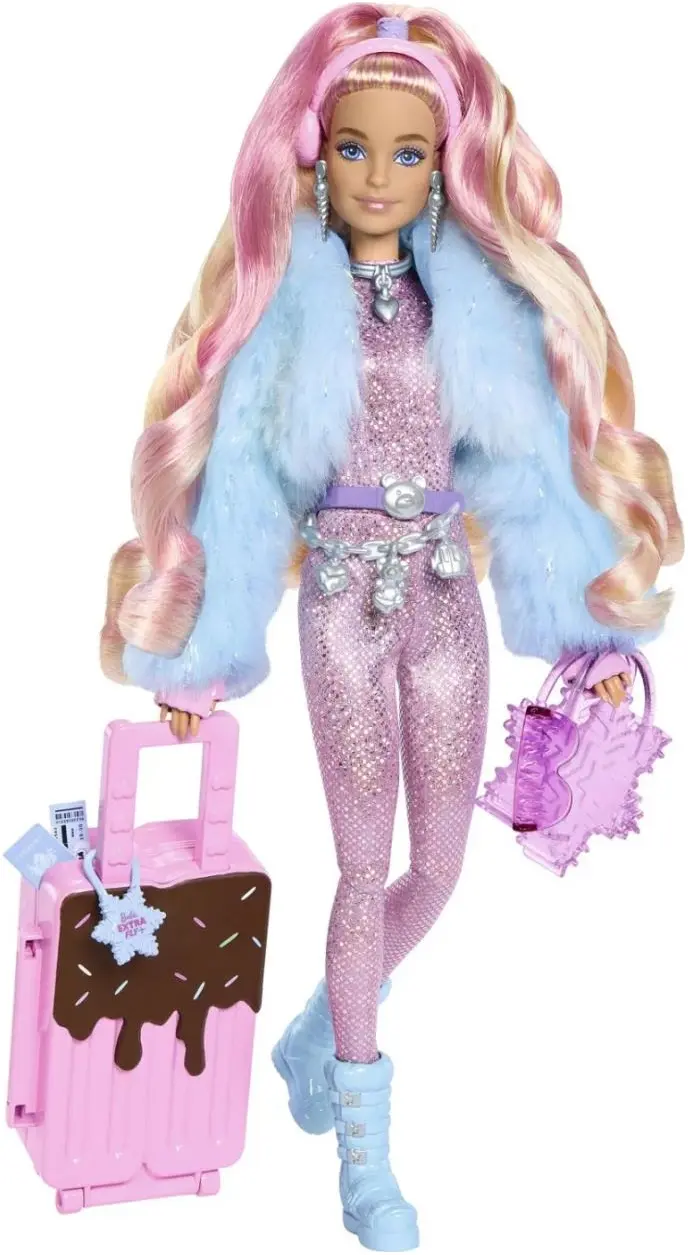 Odvažan izgled i sjajni dodaci: Opremljena za ostavljanje dojma, Barbie Extra Fly nosi plavi krzneni kaput iznad sjajnog ružičastog skijaškog odijela, odražavajući svoju živahnu osobnost i strast za modom. Njena duga kosa ima istu sjajnu ružičastu nijansu kao odjeća, dodajući dodatni glamur. S više od 15 dodataka, uključujući ušne obloge, rukavice bez prstiju, čizmice i zaštitne naočale, ova lutka poziva na izražavanje osobnog stila u svakom detalju.