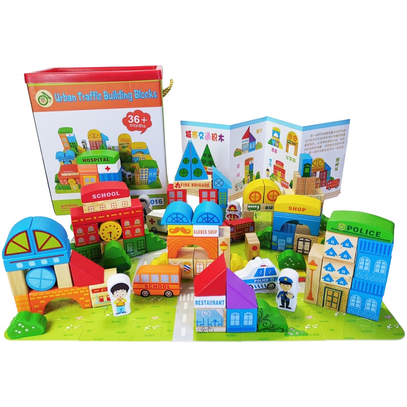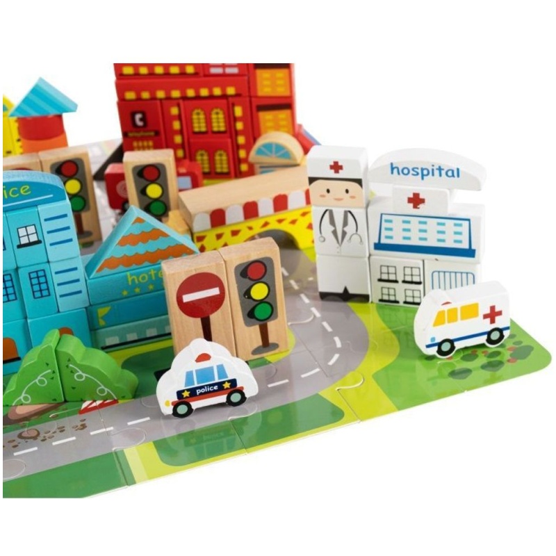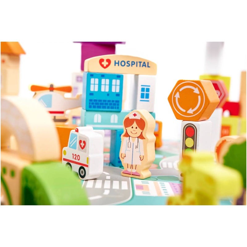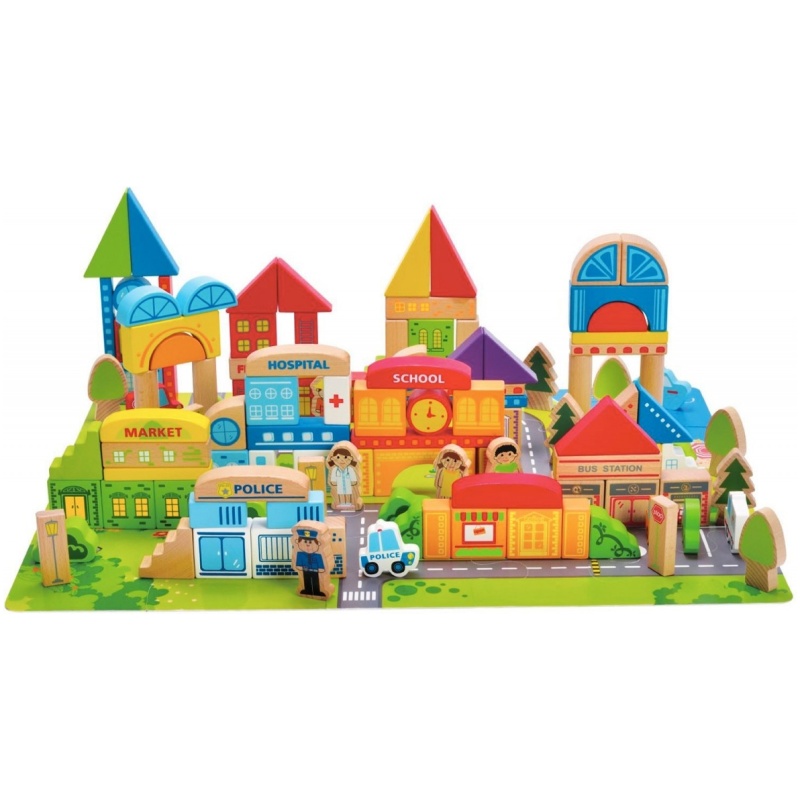 Težite novim avanturam s ovim jedinstvenim setom blokova od 100 komada! Set City Building Block Set savršen je za svakog malog arhitekta ili ambicioznog urbanista. Zamislite i izgradite vlastiti grad za sate konstruktivne zabave koristeći inovativno dizajnirane blokove. Set prikazuje škole, policijske postaje, bolnice i tržnice, kao i građane, potičući maštovitu igru pretvaranja. Kao i svi naši proizvodi, ovaj je set izrađen od održivog masivnog drva s netoksičnim bojama sigurnim za djecu.