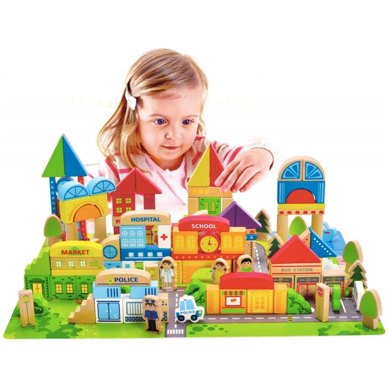 Set City Building Block Set savršen je za svakog malog arhitekta ili ambicioznog urbanista. Zamislite i izgradite vlastiti grad za sate konstruktivne zabave koristeći inovativno dizajnirane blokove. Set prikazuje škole, policijske postaje, bolnice i tržnice, kao i građane, potičući maštovitu igru pretvaranja!