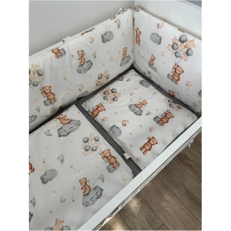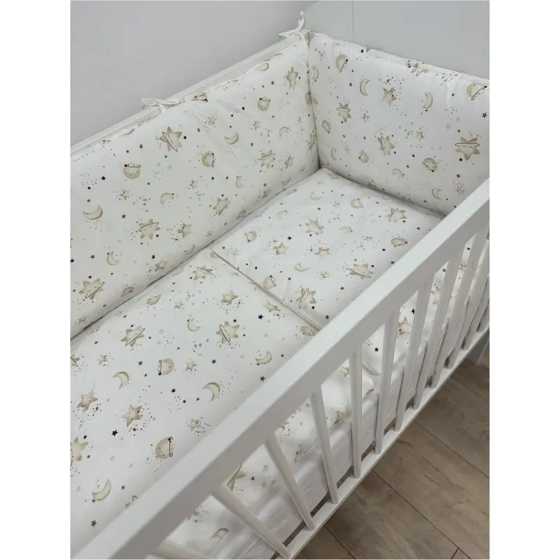 Ogradica je izrađena od vrhunskog pamučnog materijala i pruža dodatnu zaštitu i udobnost tvojem mališanu. Nježna i mekana na dodir, osigurava da tvoje dijete spava udobno, omogućavajući mu da se osjeća zaštićeno i sigurno. Ogradica se jednostavno pričvršćuje na krevetić pomoću vezica, što čini postavljanje brzim i jednostavnim.