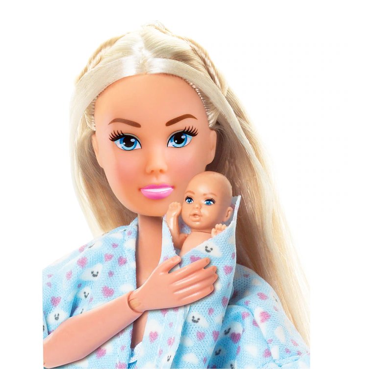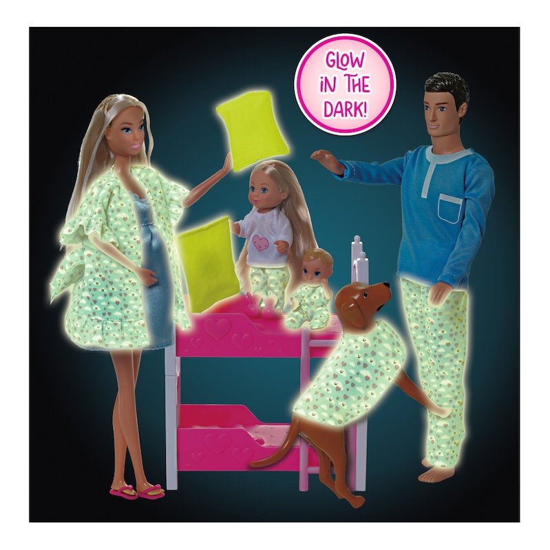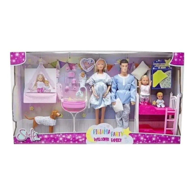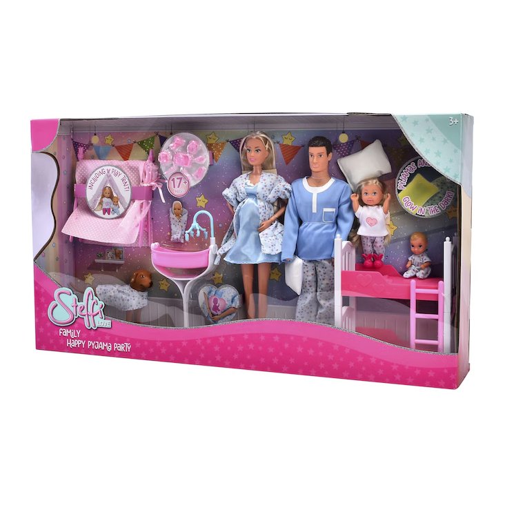 Zamislite veselu obiteljsku atmosferu gdje Steffi, zajedno sa svojim mužem Kevinom, sestrom Evi, malim bratom i preslatkim psom, uživa u pidžama partyju. Set dolazi s pokretnim rukama kako bi Steffi mogla nježno zagrliti novorođenče, a tu su i šator za igru, krevet na kat i mnoštvo dodataka za novorođenče. Sve to doprinosi nebrojenim mogućnostima za kreativnu igru.