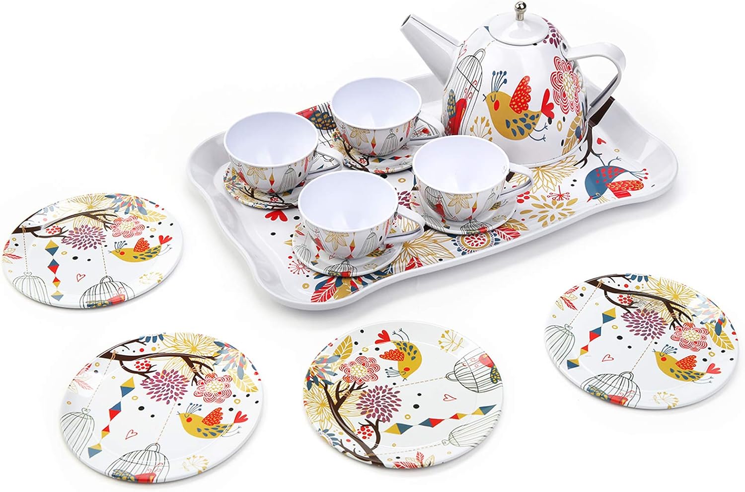 Prekrasan dizajn: Svaki komad ukrašen je nježnim ilustracijama ptica, cvijeća i kaveza, što set čini vizualno neodoljivim.