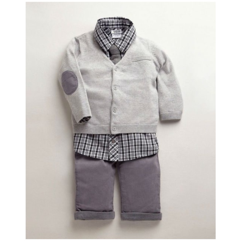 Kvalitetni komplet za dječake modernog je dizajna i lijepih boja. Dolazi u četiri dijela, hlače, košulja, kravata i džemper. Džemper je sive boje sa gumbičima, a na laktovima ima modne umetke. Košuljica je s dezenom na kockice te idealno pristaje uz ovu kombinaciju. Hlače su također sive boje kao i kravata. Prikladan je i moderan poklon za svakog dječaka. Prikladno za pranje u perilici. Sastav: 100% pamuk.