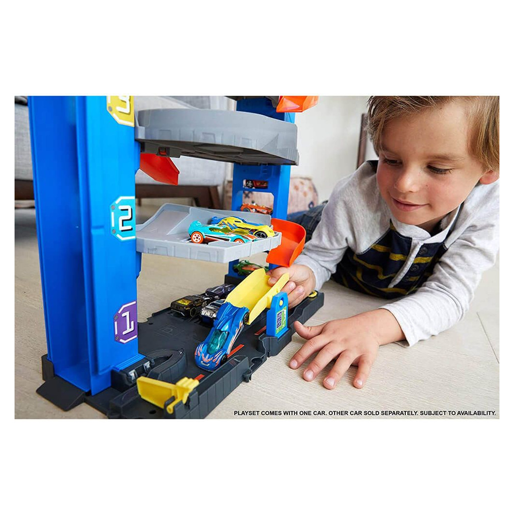 S praktičnim liftom, djeca mogu jednostavno podizati svoja vozila na željenu razinu i birati žele li ih parkirati ili se spustiti na donji kat. Interaktivni shifteri vode automobile na točno određene katove, dok glavna etaža nudi mogućnost provjere auta, točenja goriva i pripreme za sljedeću pustolovinu. Sve se besprijekorno povezuje s ostalim Hot Wheels stazama, pa omiljena kolekcija raste zajedno s djetetovom maštom.