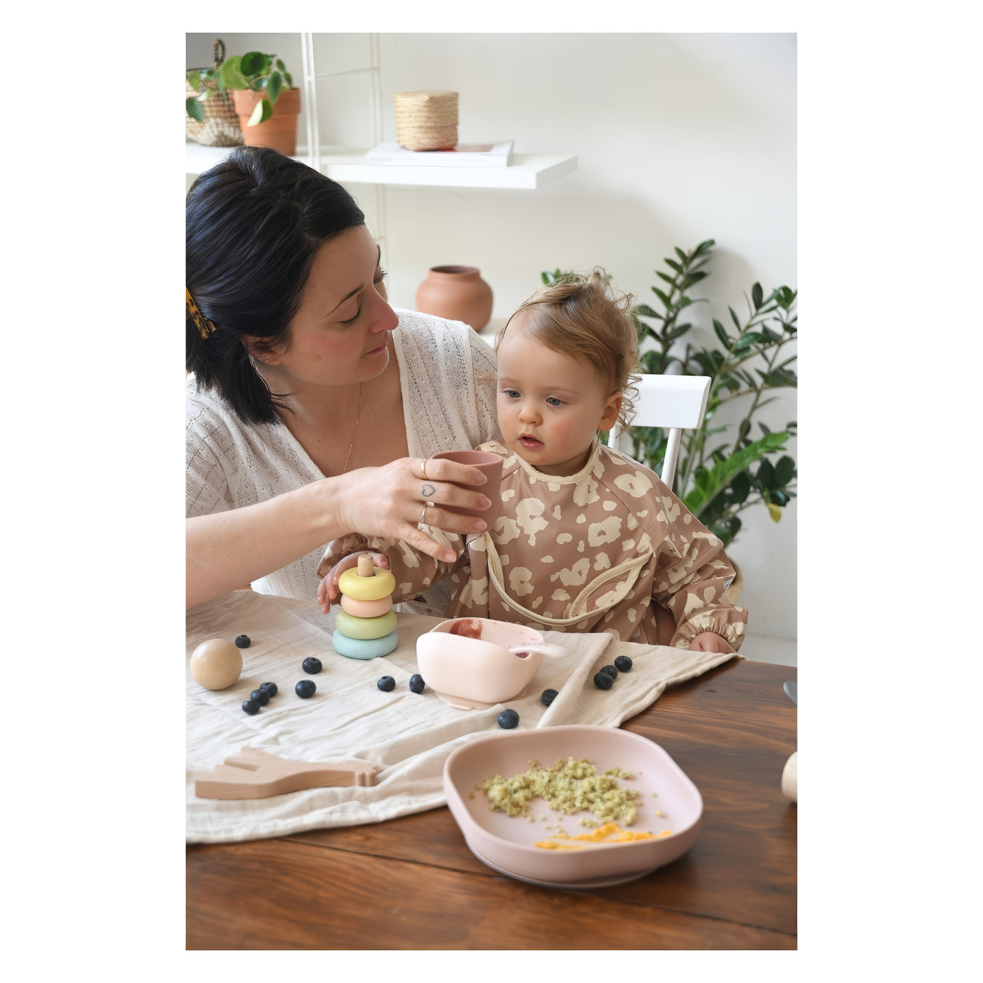 Vrijednost ovog seta nije samo u lijepom izgledu, nego u tome što u jednom paketu dobivaš osnovu za prve obroke: tanjur, zdjelicu, čašu i žlicu, s detaljima koji olakšavaju djetetu da nauči jesti samostalnije.