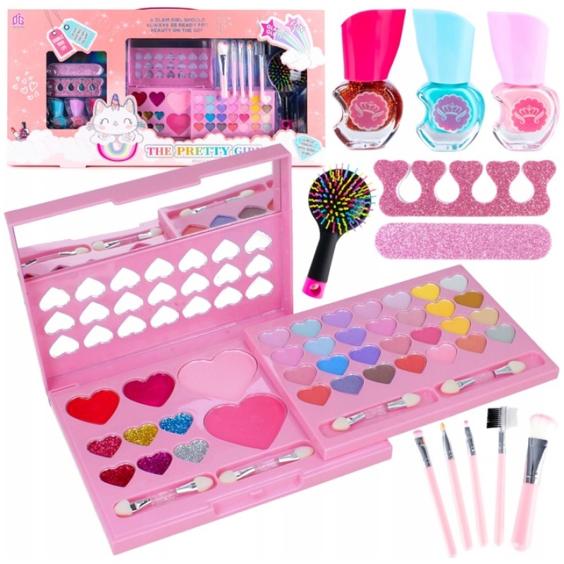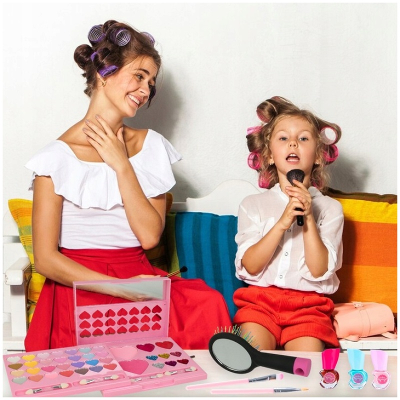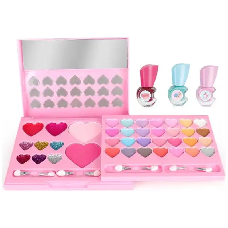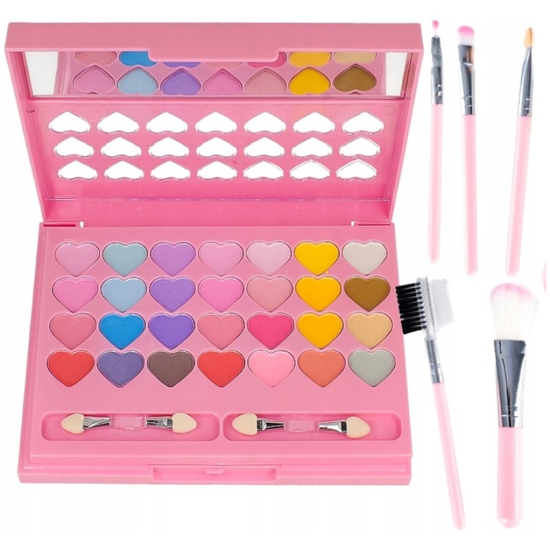 Set sadrži široku paletu od 28 različitih boja sjenila, što omogućuje djeci da stvaraju raznovrsne stilizacije. Osim sjenila za oči, set također uključuje rumenila i sjajila za usne u obliku srca. Dodatno, set sadrži i šest različitih boja šljokica koje mogu upotpuniti make-up.