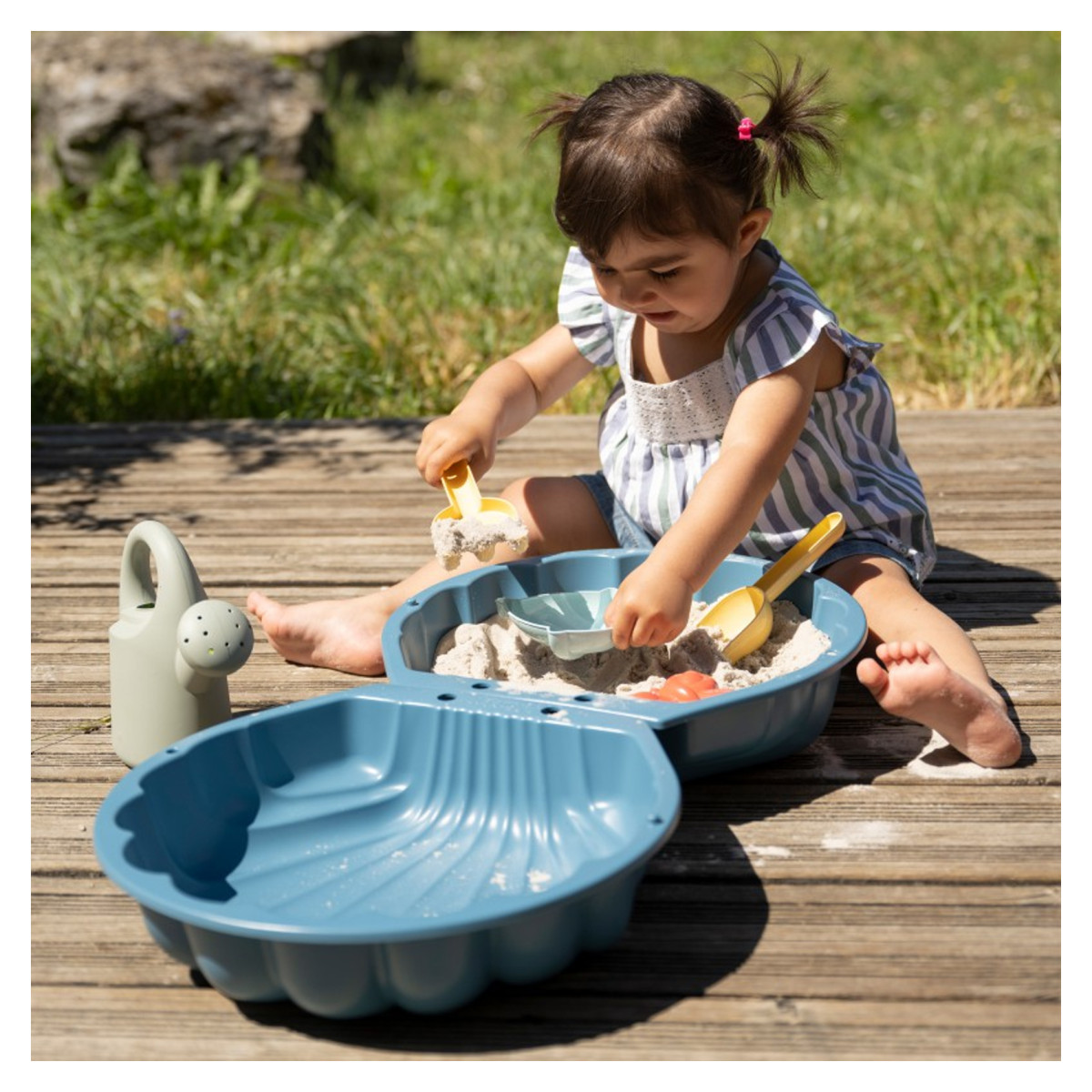 Dva dijela mogu se koristiti otvoreno tijekom igre, a nakon korištenja zatvoriti kako bi sadržaj bio zaštićen. Materijal otporan na vremenske uvjete i jednostavna konstrukcija čine ovaj pješčanik praktičnim izborom za djecu od 12 mjeseci naviše.