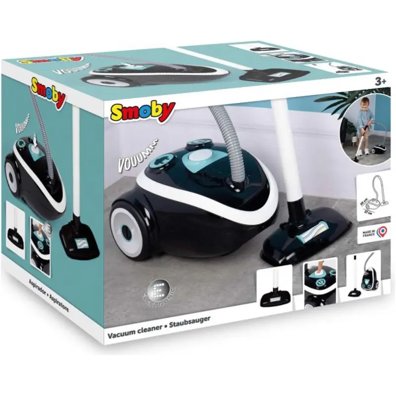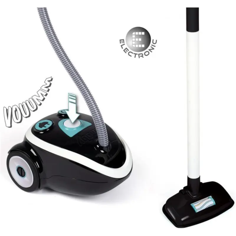 Smoby usisavač igračka s realnim zvukom usisavanja. Crni usisavač ima akvaminske detalje i kotače koji omogućuju vožnju po sobi. Izrađen je od čvrste plastike i pogodan je za djecu od 3 godine.