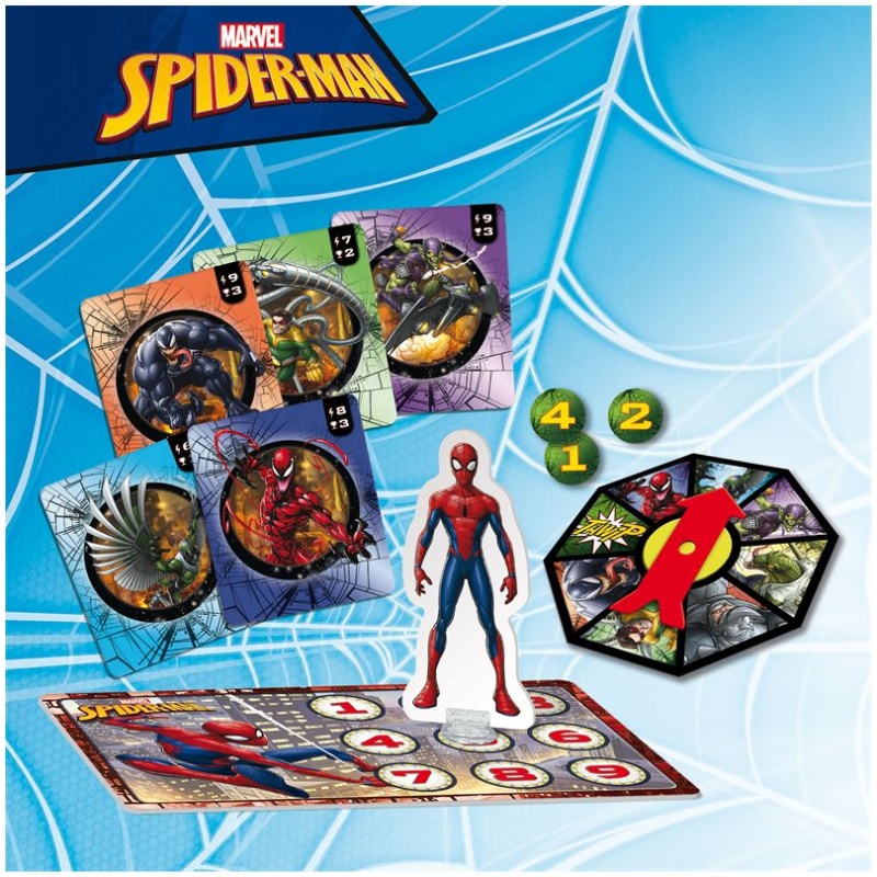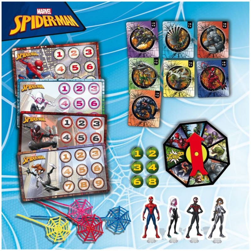 Sadržaj igre uključuje spinner, likove pijune, tokene, neprijateljske siluete, oznake rezultata i ljepljivu paučinu. Sve je pažljivo osmišljeno da ti pruži autentično iskustvo borbe protiv zlikovaca.
