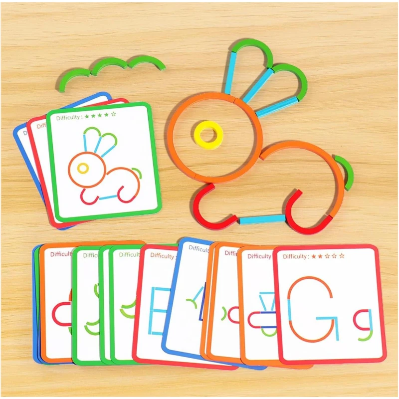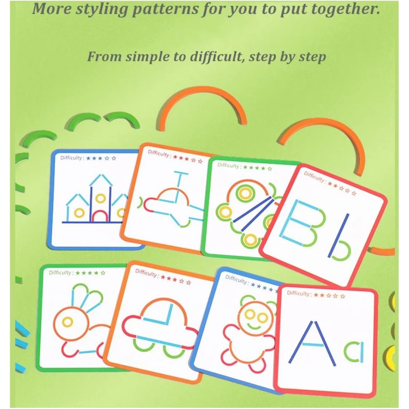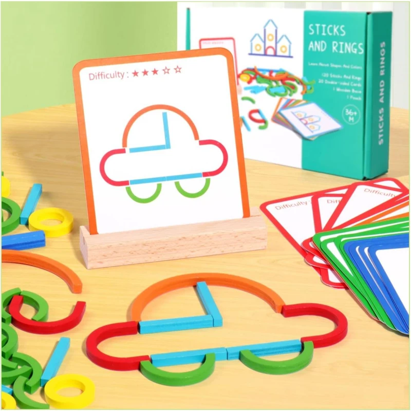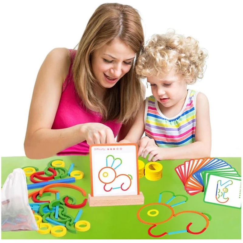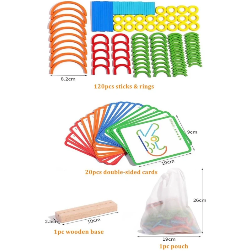 U paketu ćete pronaći 120 štapića i prstenova, 20 kartica s obje strane, drvenu podlogu i torbu za pohranu. Ova igračka je odličan alat za predškolsko učenje koji će vašem djetetu pomoći da razvije svoje vještine prepoznavanja oblika i boja, koncentraciju, maštu, koordinaciju i senzorne sposobnosti.