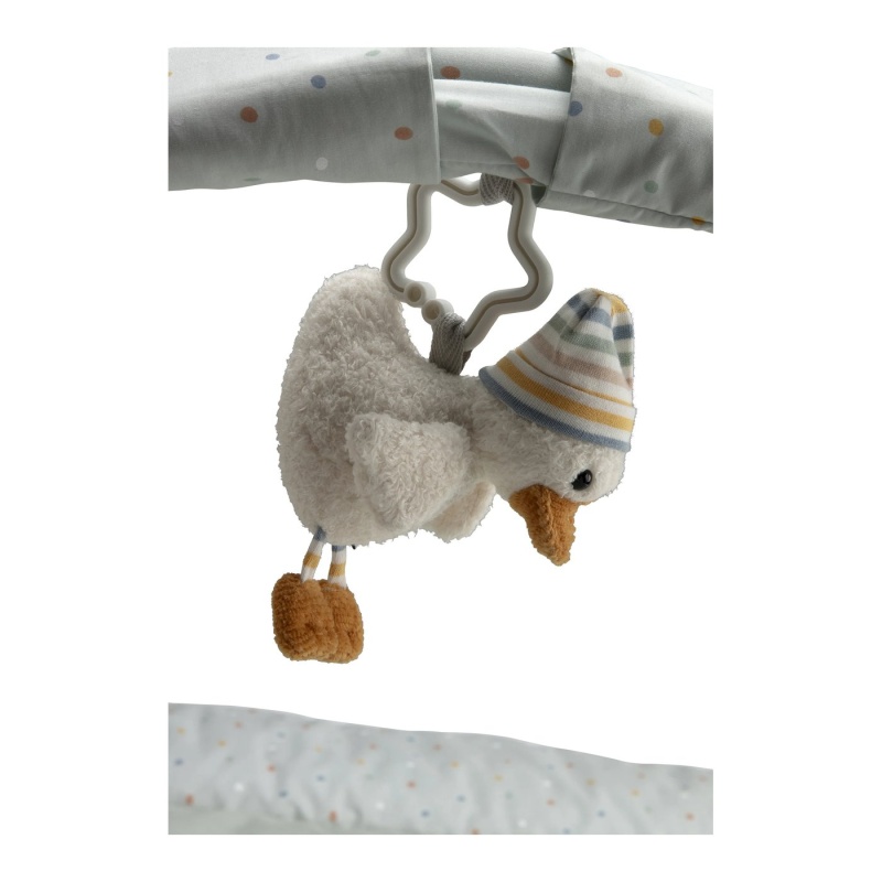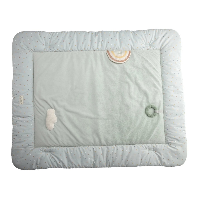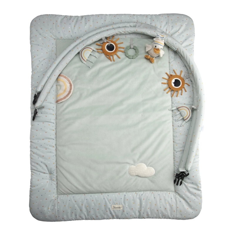 Sterntaler Podloga Za Igru nudi nesvakidašnji spoj zabave i udobnosti. Zahvaljujući debelom punjenju, vašem će djetetu biti osigurana maksimalna udobnost prilikom igre ili odmora. Iznad podloge se nalazi luk s raznim igračkama kao što su slatka tkaninska patka i šarene duge, koje kriju brojna iznenađenja poput ogledala i zvučnih elemenata. Svaki od elemenata može se lako skinuti, omogućujući vašem djetetu da se igra i mazi s njima.