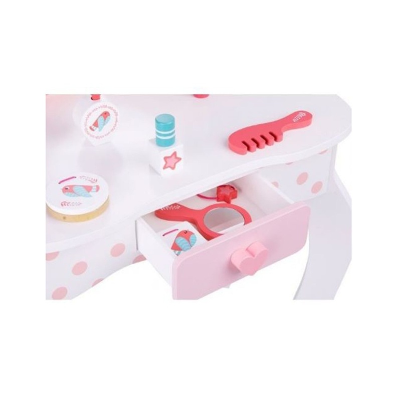 Ovaj stol nije samo lijep na prvi pogled, već je i promišljeno osmišljen s detaljima koji ga čine posebnim. S dvije ladice, vaša djevojčica može organizirati svoju kozmetiku, češljeve i nakit, stvarajući osjećaj urednosti i samopouzdanja. Dodatak poput češlja, ogledala, laka na nokte i ruža pomažu u poticanju kreativnosti i istraživanju svijeta ljepote. Vaša princeza će uživati u igranju i uljepšavanju, osjećajući se kao prava kraljevna.