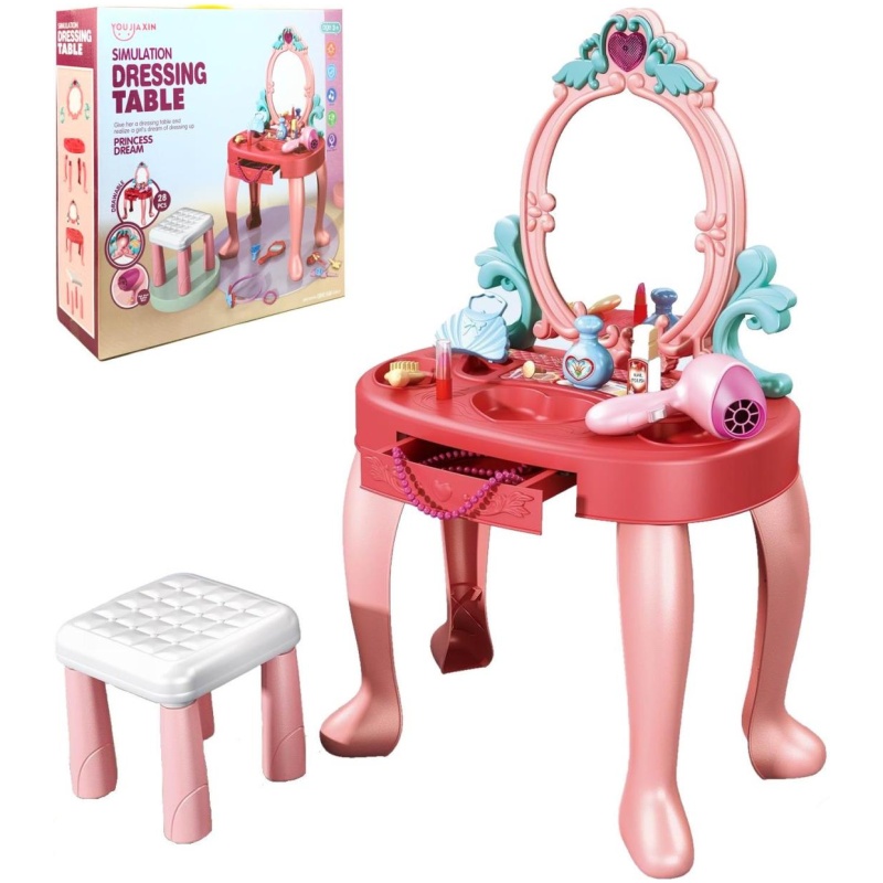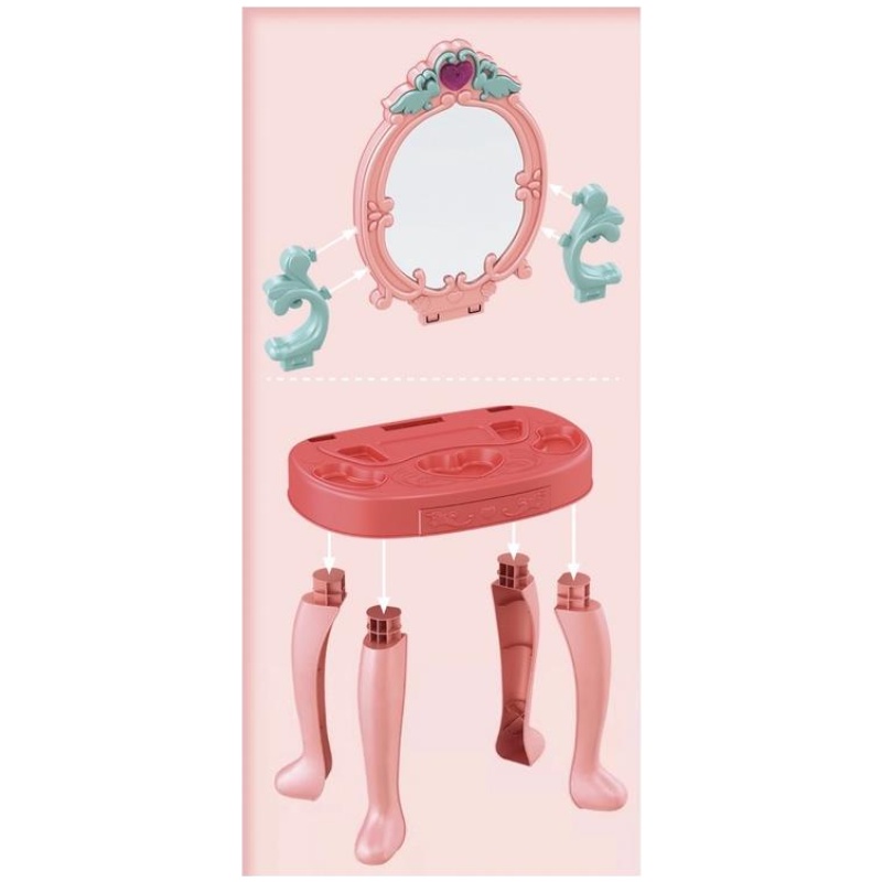 Set uključuje: toaletni stolić, stolicu, ogledalo za igračke, sušilo za kosu, ukrase za kosu, češljeve, torbicu, kozmetiku (lutku).