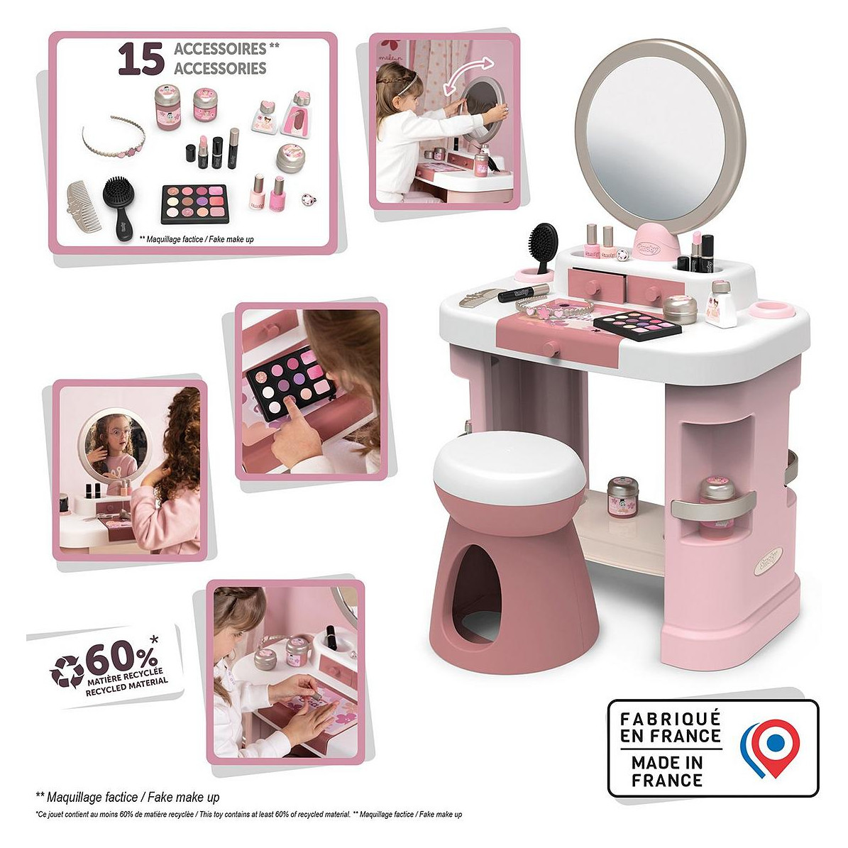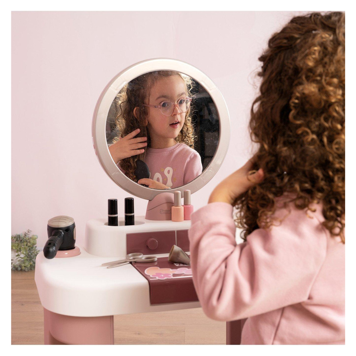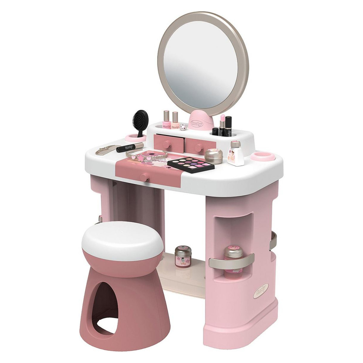 Toaletni stolić Smoby My Beauty s 15 dodataka namijenjen je djeci koja vole igru uređivanja, češljanja i spremanja modnih dodataka. Stabilan format i praktične dimenzije čine ga prikladnim za svakodnevnu igru kod kuće.